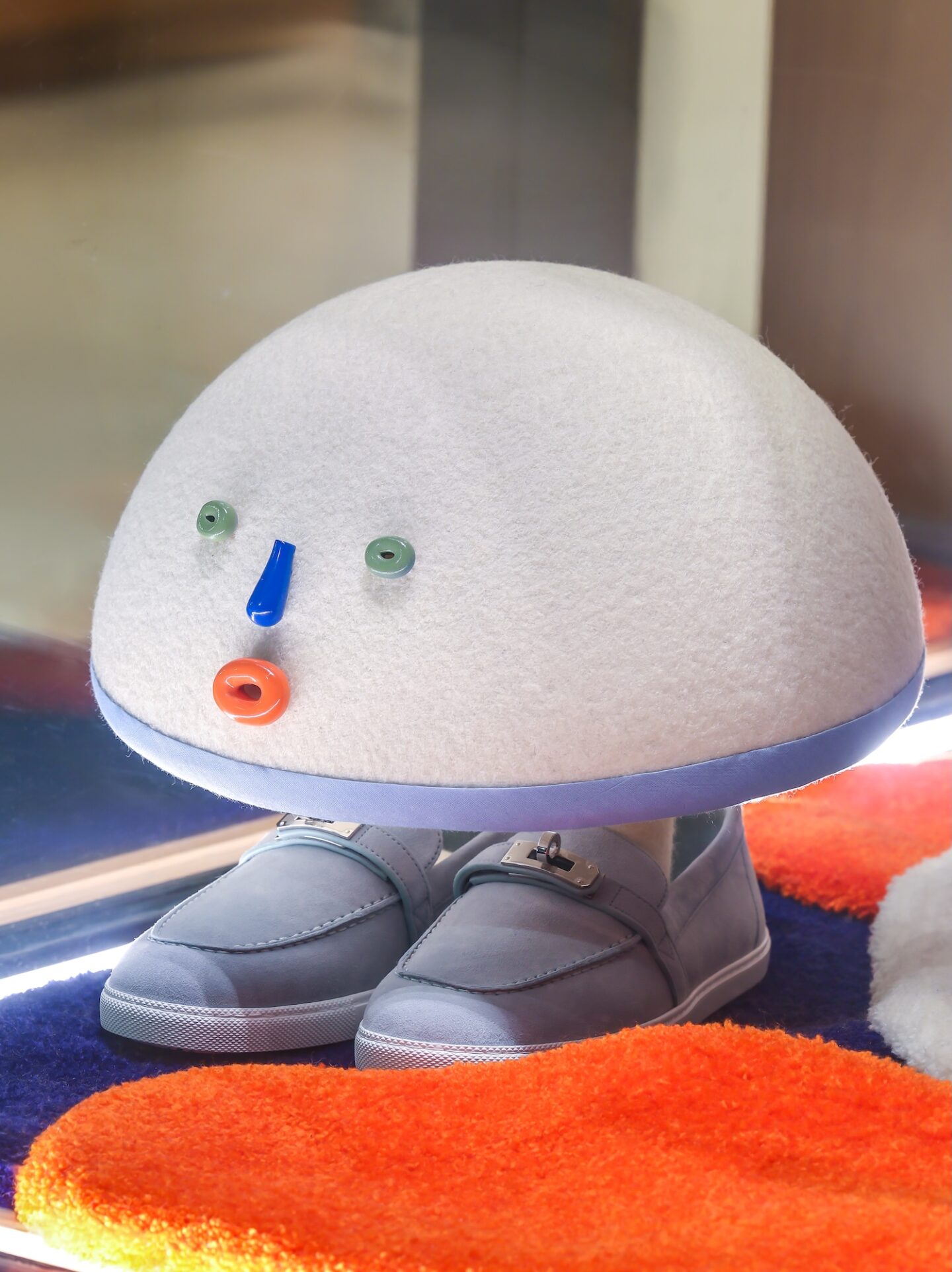 Los objetos Hermès —guantes, corbatas, cinturones y llaveros— se transforman en elementos narrativos, integrándose orgánicamente con la instalación y reforzando la relación entre artesanía y creatividad. La actitud serena del jinete, acariciando una flor, resume el espíritu de la Maison: curiosidad, exploración y respeto por la tradición.
