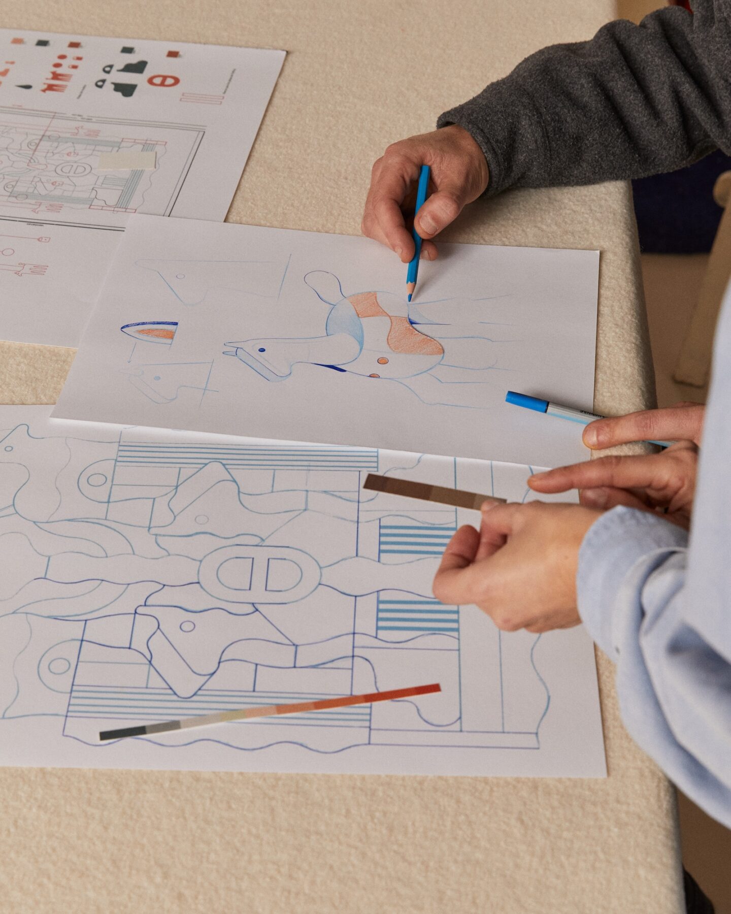 Para Twee Muizen, la conexión con la Maison estaba casi predestinada: su amor por el detalle, la tradición y la artesanía encaja a la perfección. «Casi nos consideramos artesanos, pero de la vida», dicen. Todo está hecho a mano, cada pieza es única, y cada textura, color y puntada invita al visitante a mirar más allá del escaparate y explorar otros mundos.