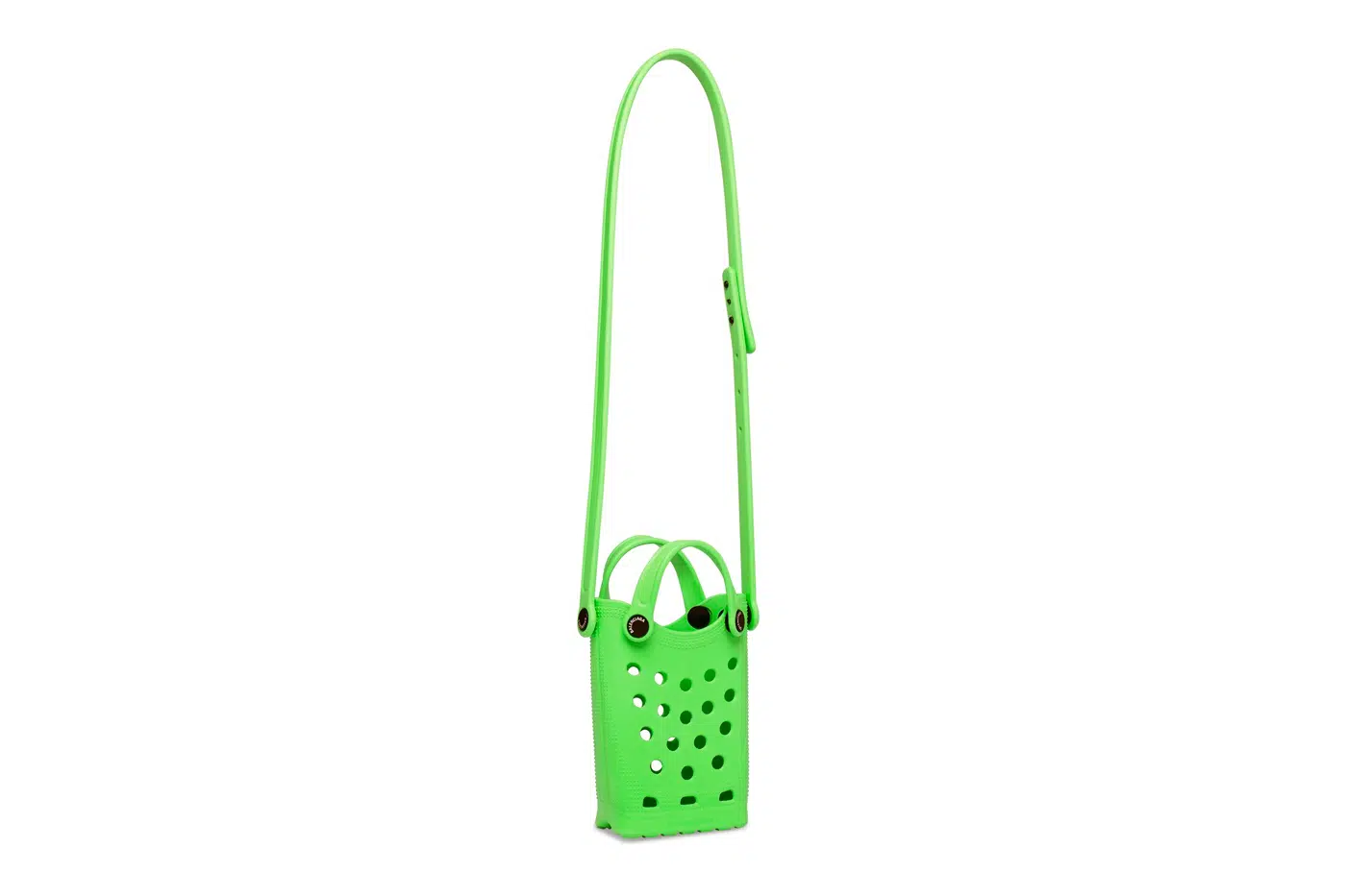 Los nuevos bolsos Crocs de Balenciaga hechos en Italia aparecieron recientemente en la campaña de otoño 2022 de la casa. Ambos modelos, tanto el Crocs Tote Bag como el Crocs Phone Holder, llegan en color verde, rosa y negro. El lanzamiento destaca por utilizar la inimitable parte superior perforada de los zuecos de Crocs como inspiración para el bolso.