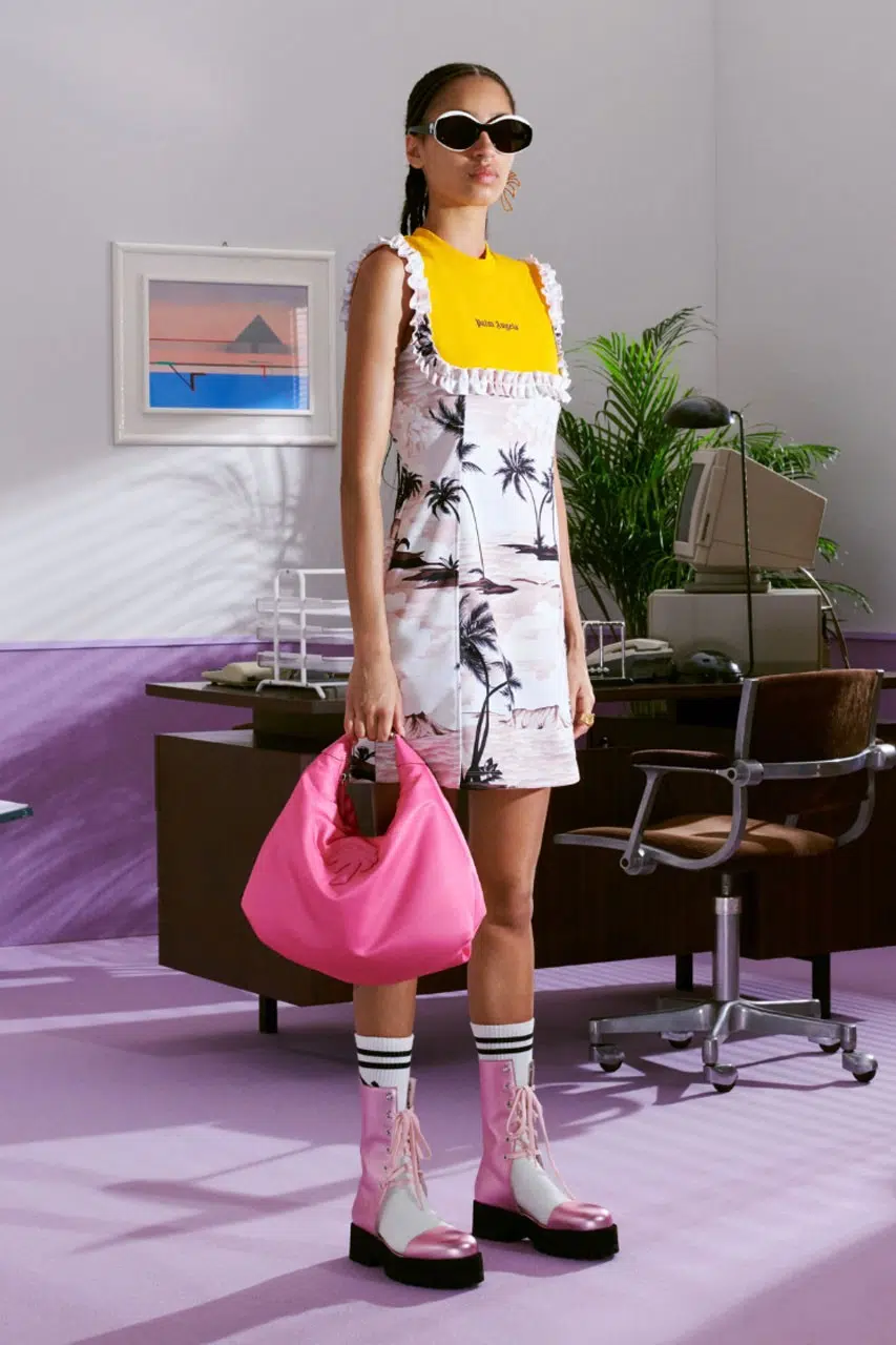 Los colores vivos y alegres de Miami se funden con la sastrería minimalista italiana para dar lugar a divertidas piezas que, sin duda, llevan intrínseco el sello de Palm Angels. Versionando las típicas camisetas de turistas encontramos fuertes referencias a Miami Vice en vestidos ajustados, camisas abotonadas y cazadoras de corte utilitario.