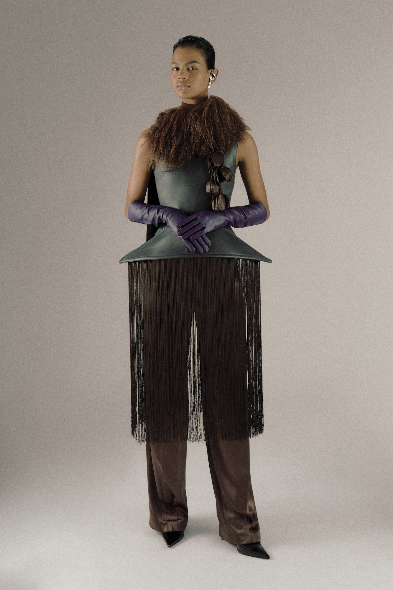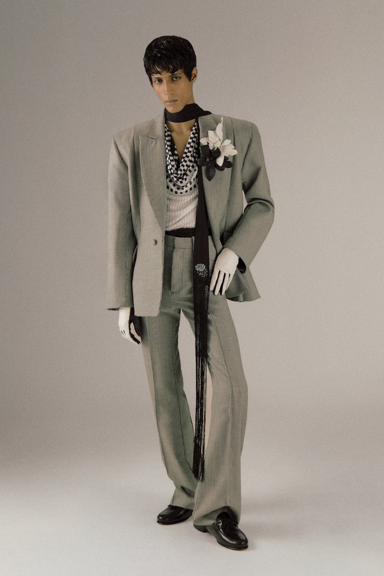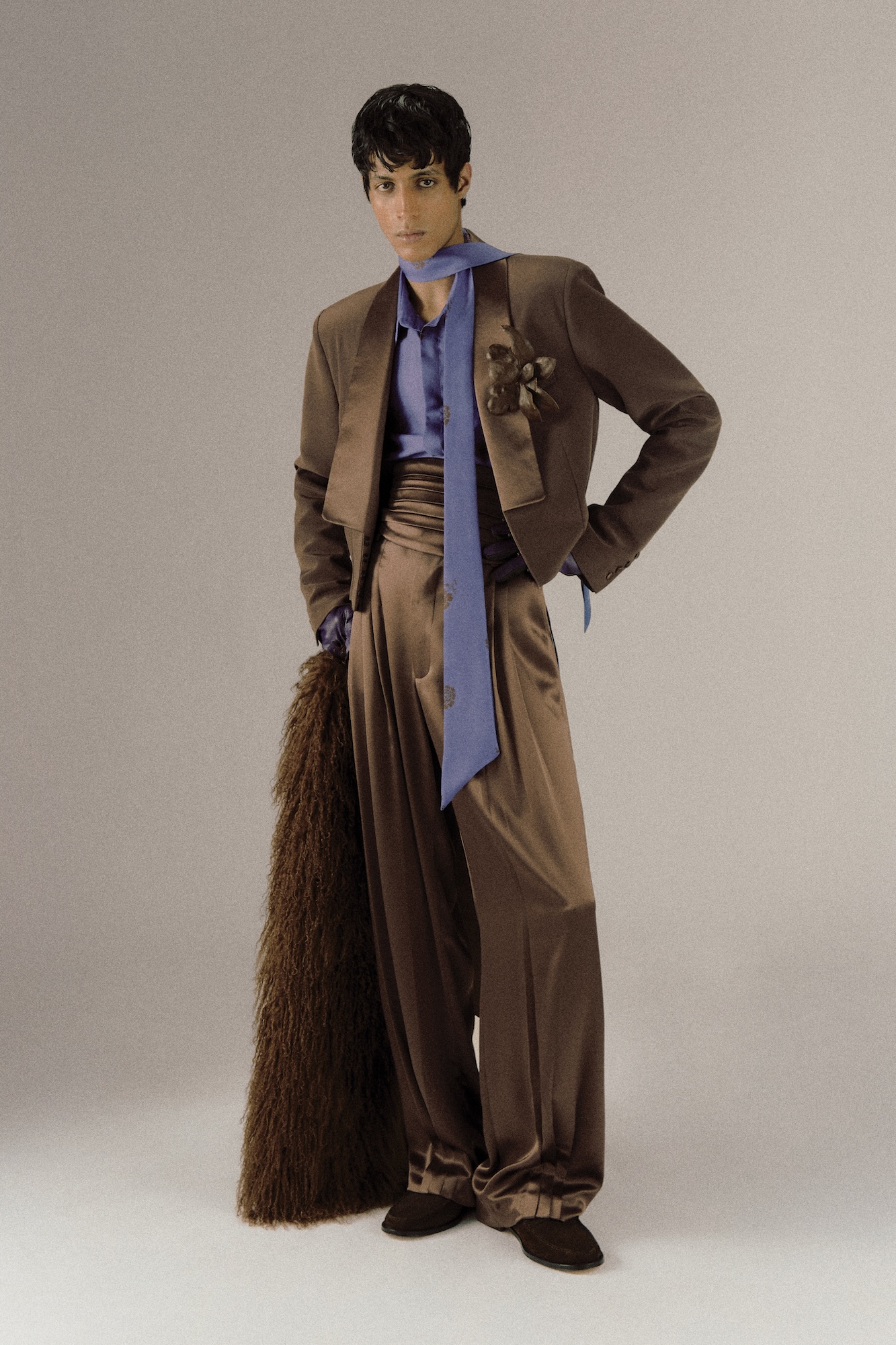 Las flores de piel -recurrentes en el imaginario de la casa- reaparecen en gris, blanco y marrón. Se presentan como broches y también en el calzado desarrollado junto a Castellanos, reforzando la narrativa de artesanía y colaboración. A ello se suman las medias de Emilio Cavallini y las joyas de Aaron Varon, creadas junto a PALOMO.