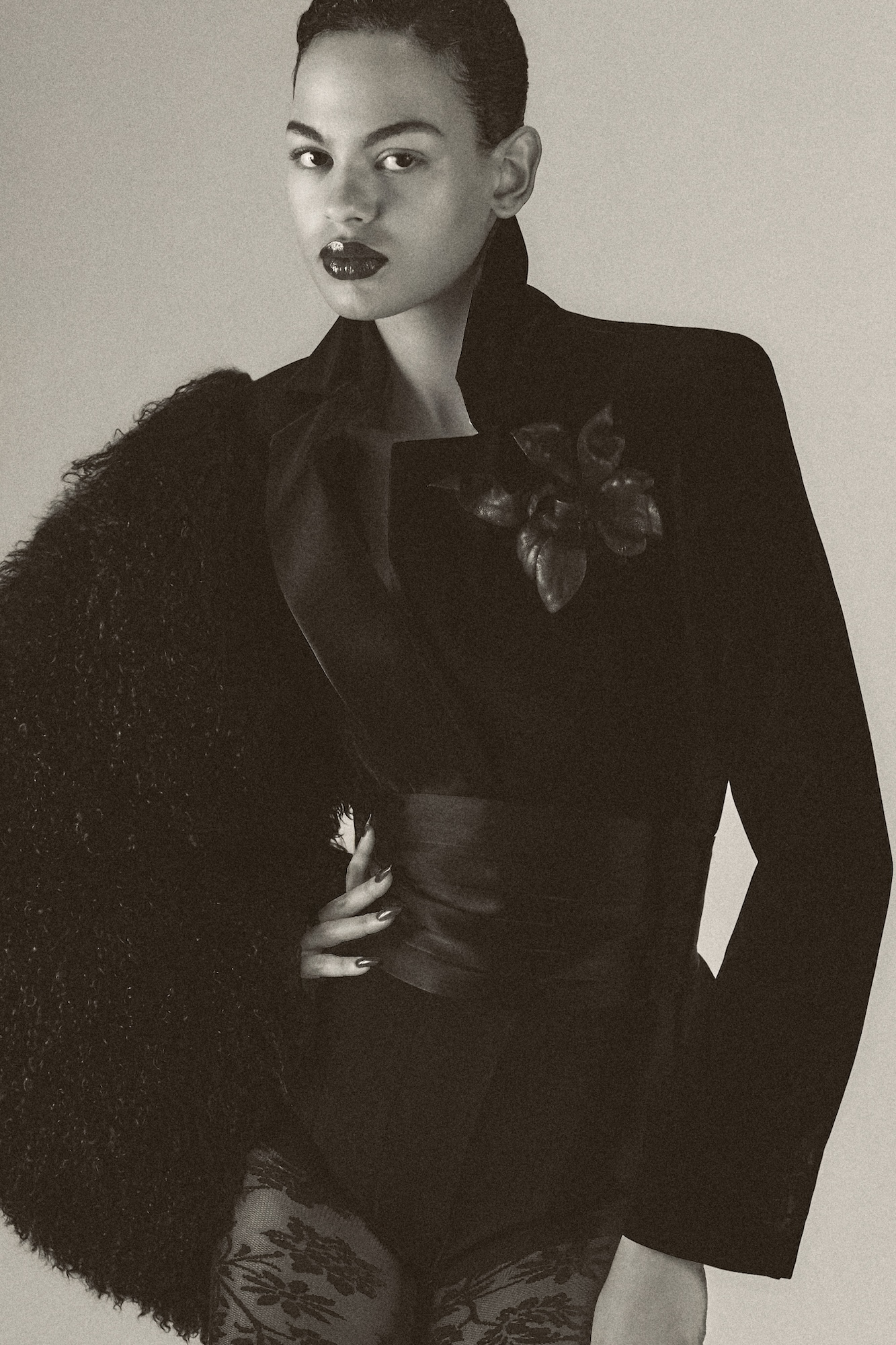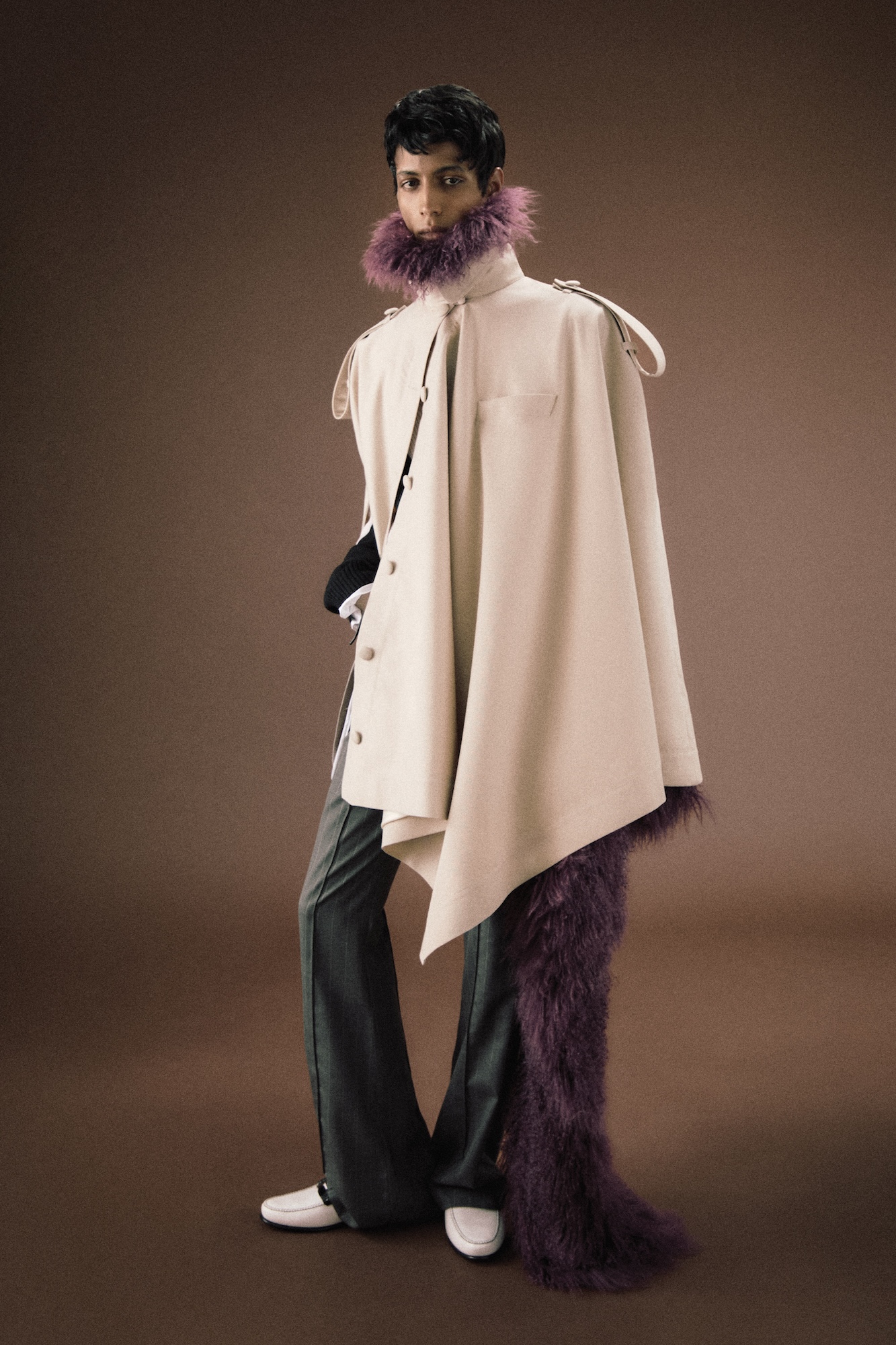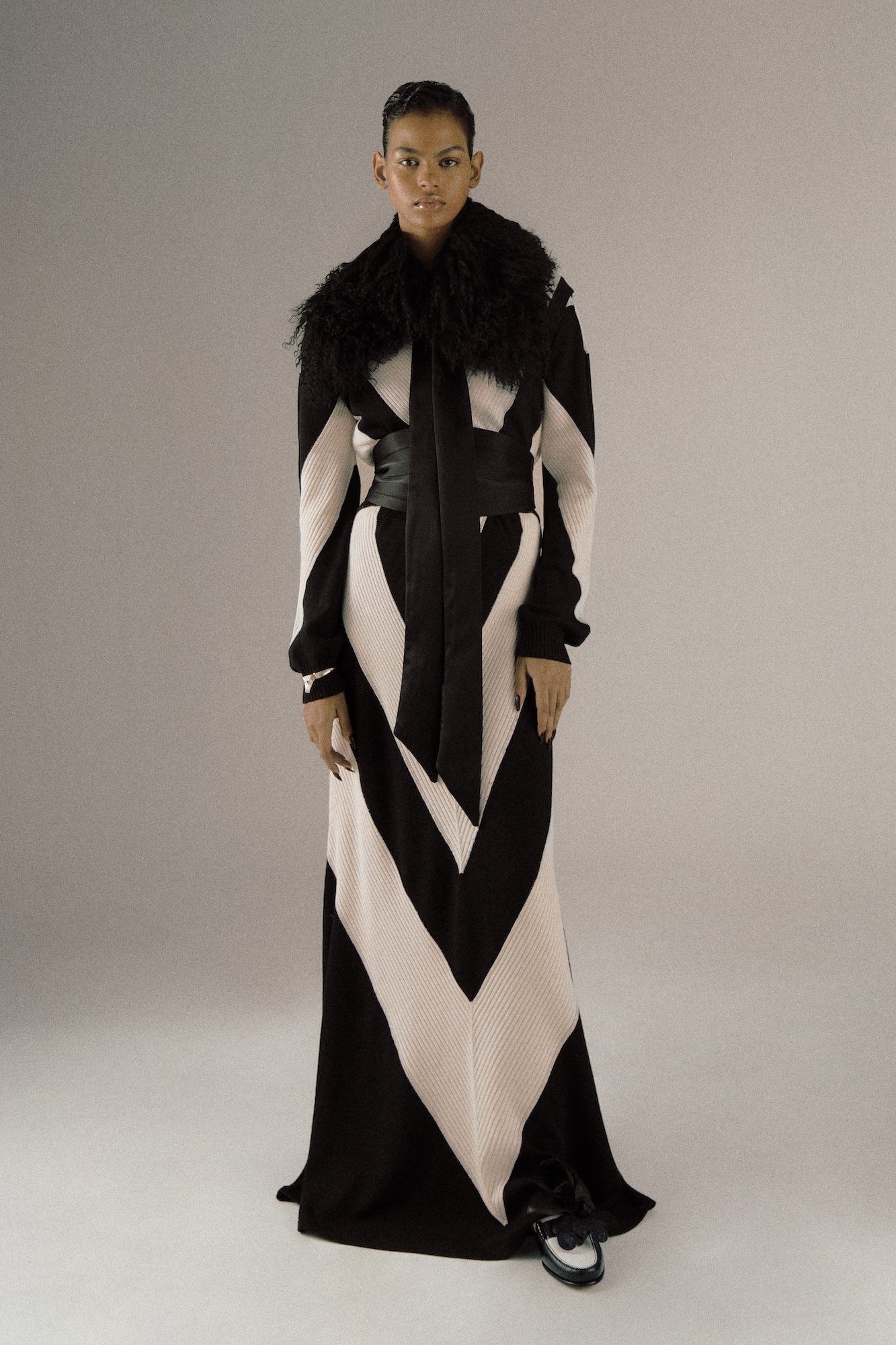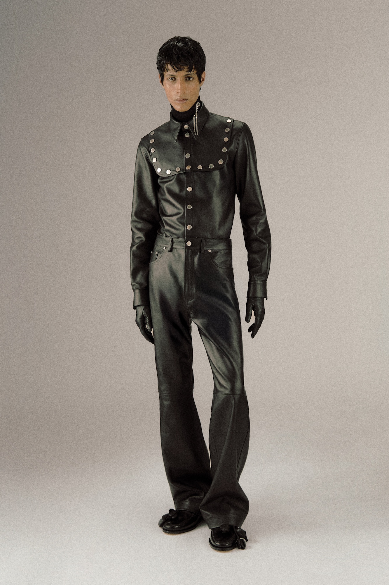 Las flores de piel -recurrentes en el imaginario de la casa- reaparecen en gris, blanco y marrón. Se presentan como broches y también en el calzado desarrollado junto a Castellanos, reforzando la narrativa de artesanía y colaboración. A ello se suman las medias de Emilio Cavallini y las joyas de Aaron Varon, creadas junto a PALOMO.