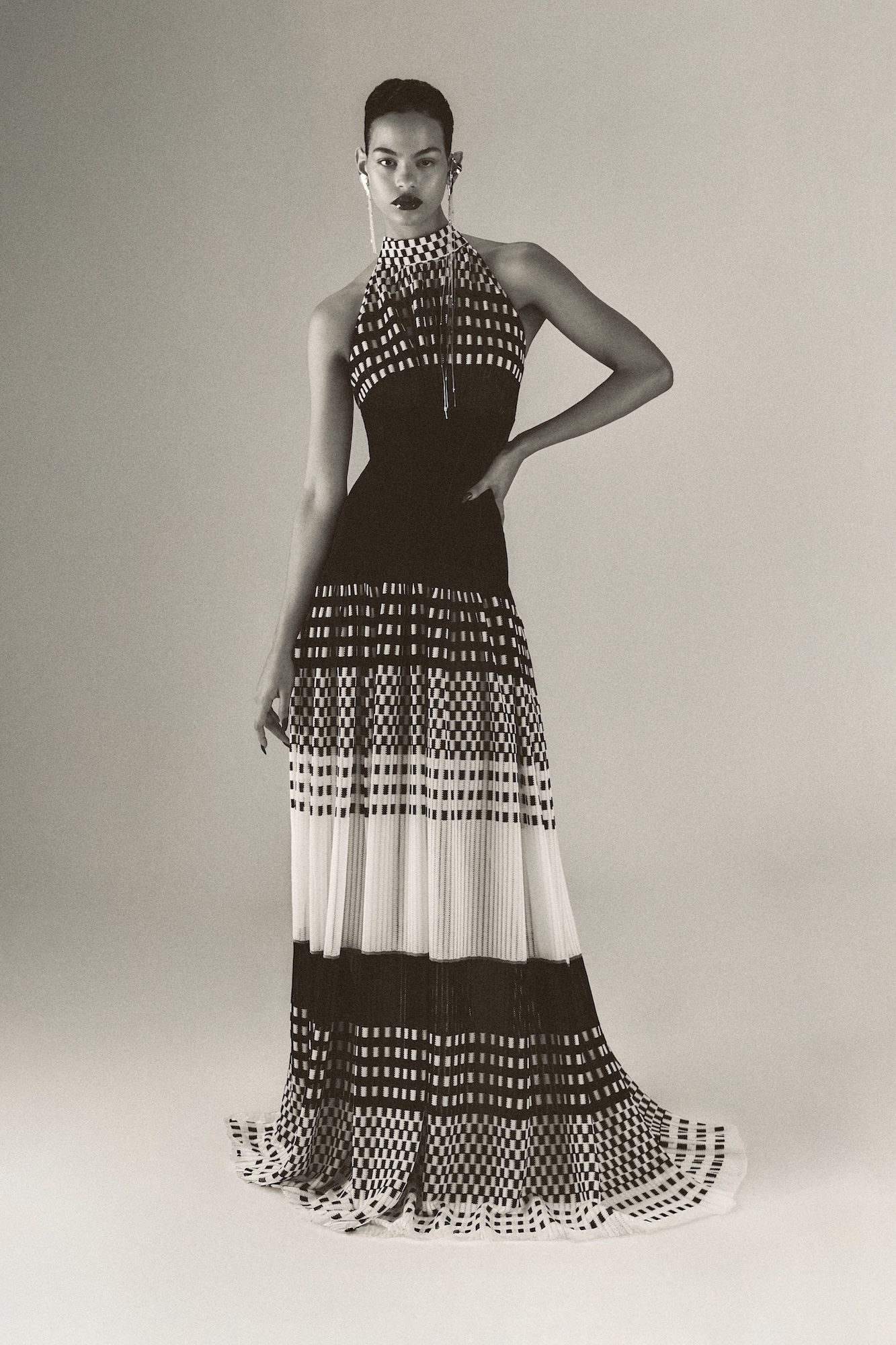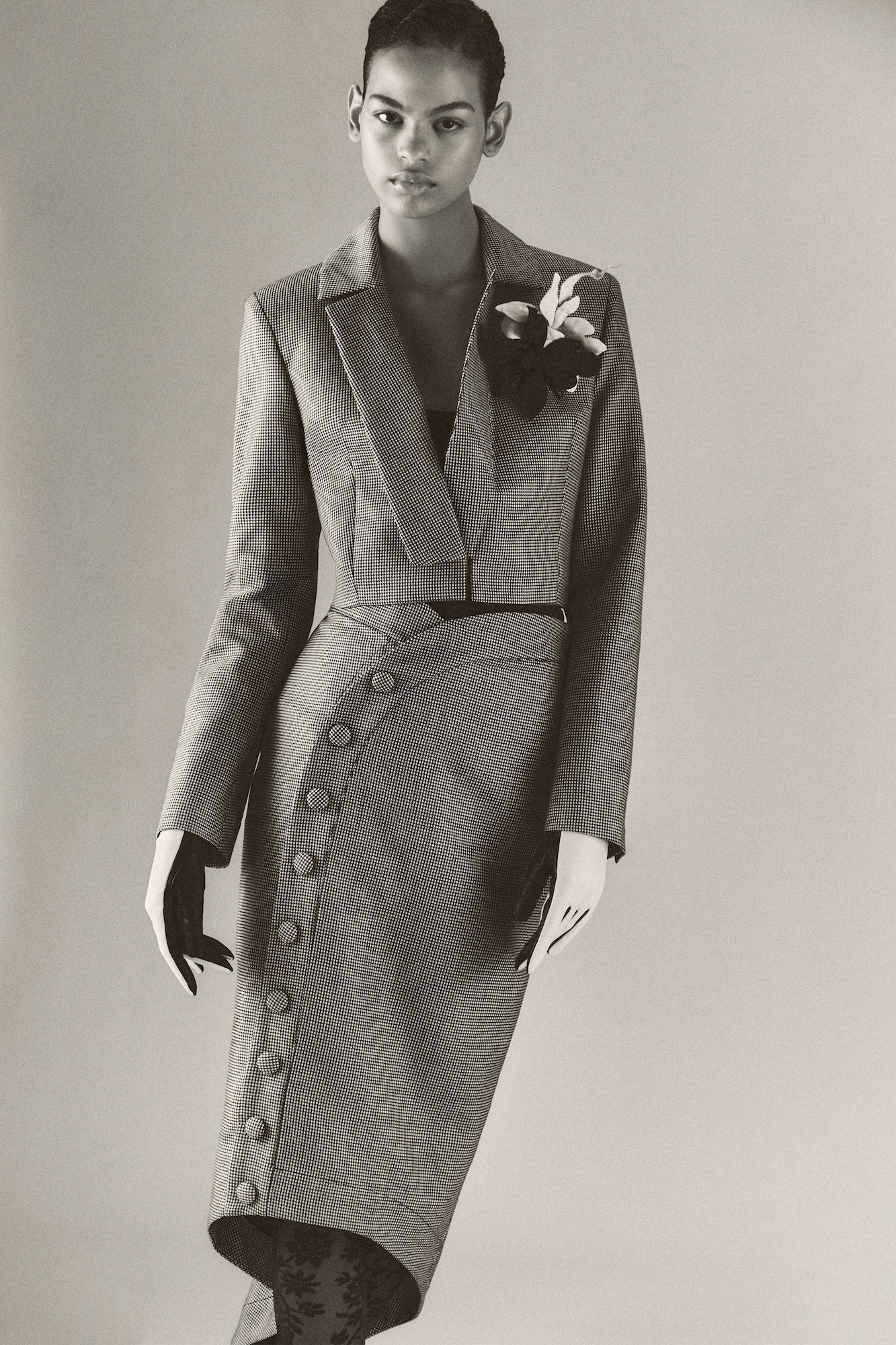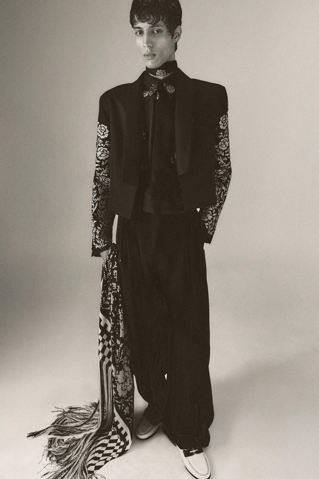 En cuanto a los materiales, ‘LIMBO’ combina sedas estampadas y rasos brillantes con lanas británicas clásicas -pata de gallo y príncipe de Gales- creando un contraste entre romanticismo y rigor. A ello se suman nuevos puntos estructurados que exploran siluetas asimétricas, aportando una dimensión mucho más técnica. El fleco de seda, realizado artesanalmente en Cantillana, funciona como el hilo conductor de la temporada. Una tradición reinterpretada desde una mirada contemporánea. Y el mantón de Manila, otro emblema cultural, se transforma en versión pixelada.