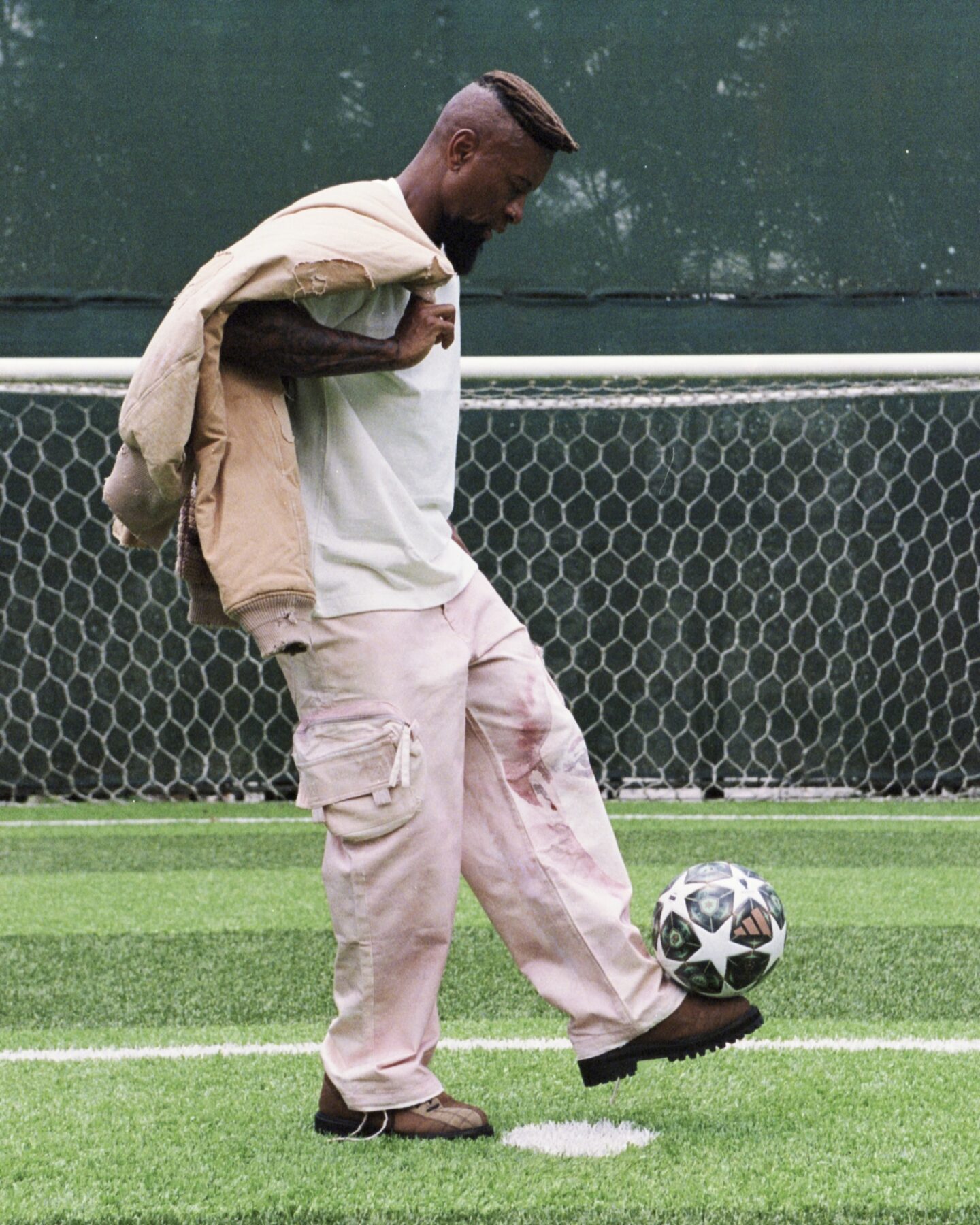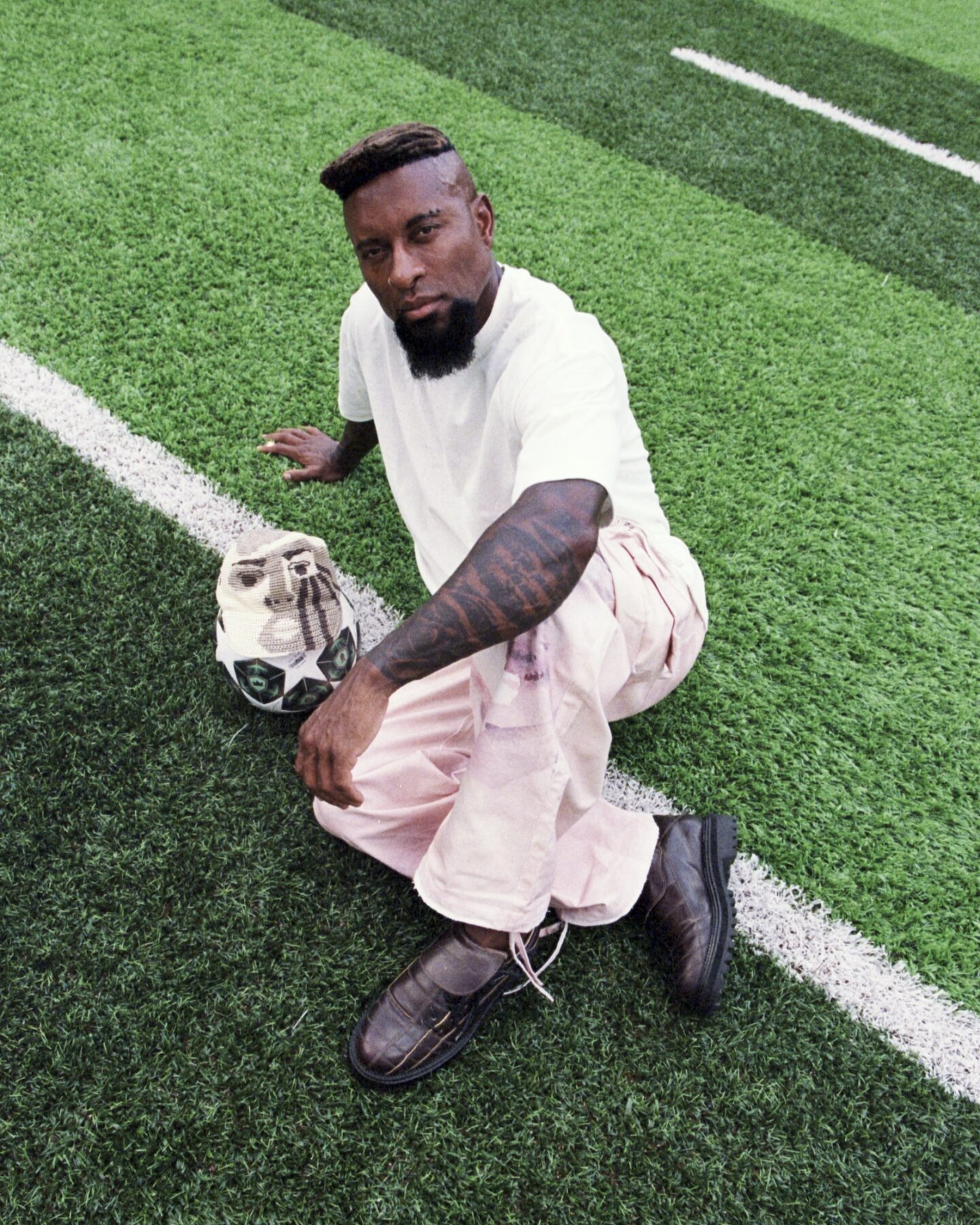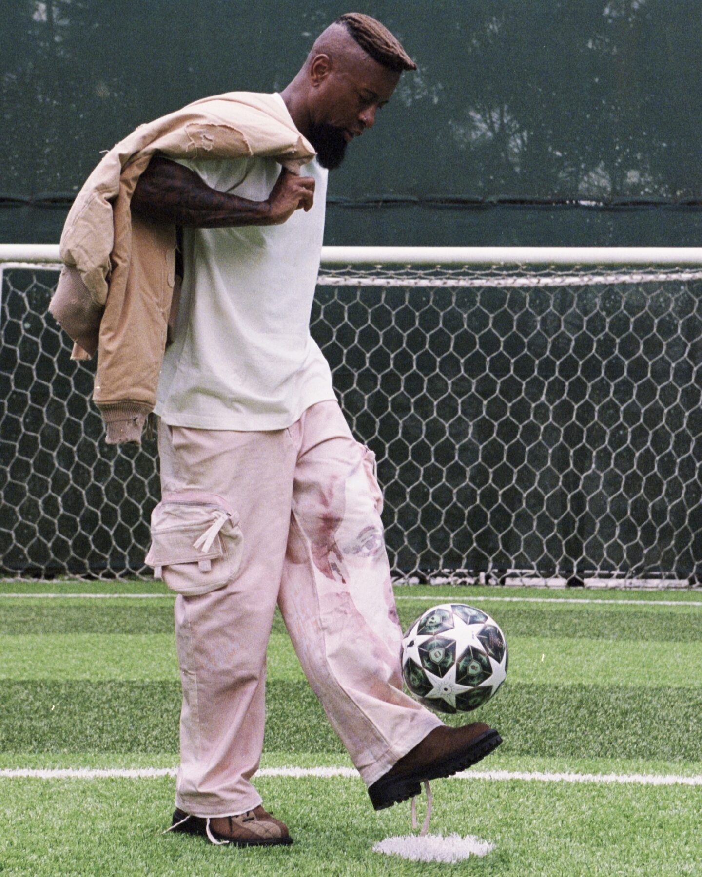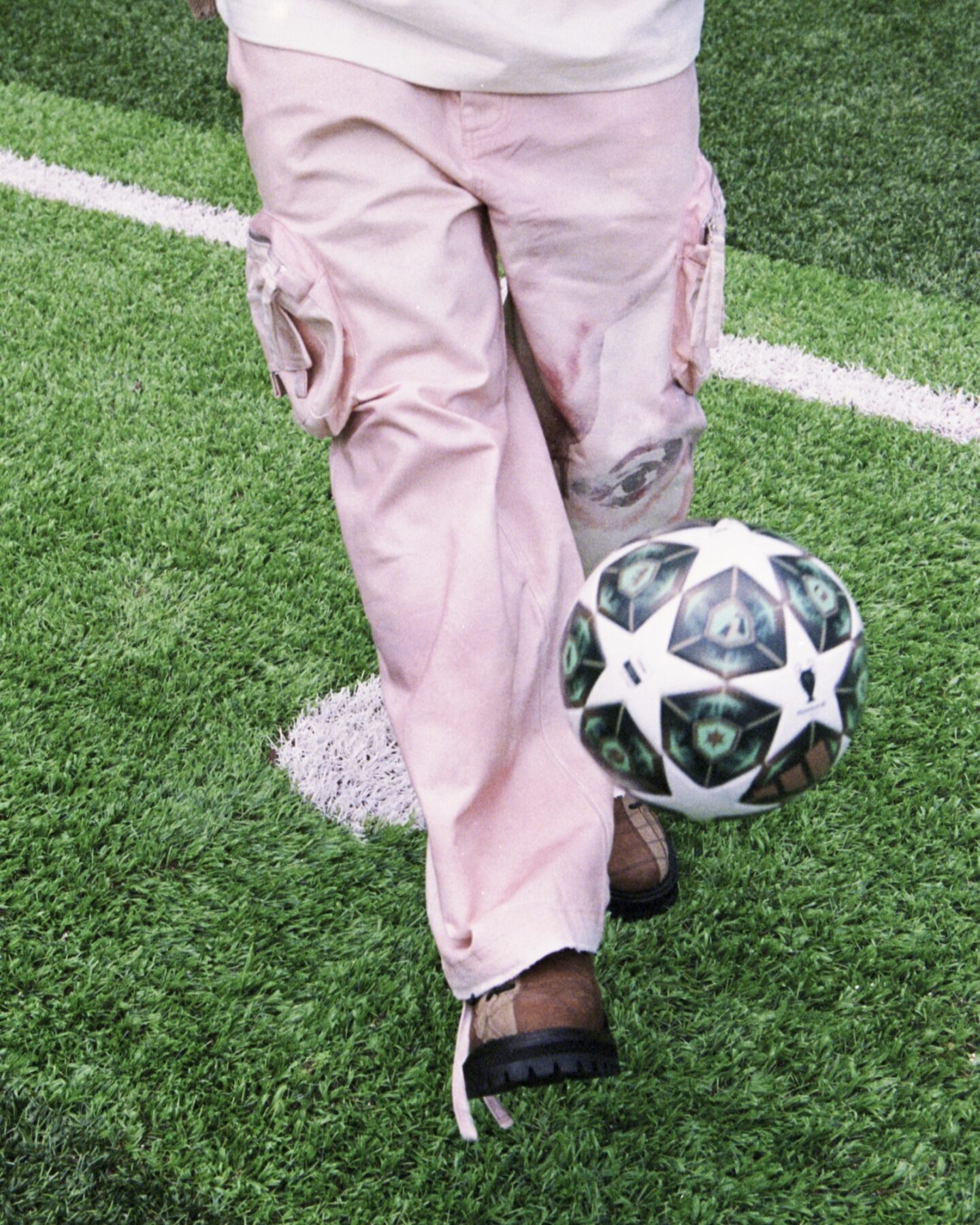 Por un lado, KidSuper aporta su inconfundible imaginario a la propuesta: ilustraciones pintadas a mano, rostros expresivos, patrones de camuflaje y una estética inspirada claramente en el fútbol y la cultura popular. Por otro, Piet despliega su técnica con algunas señas de identidad muy reconocibles: crochet, tejido 3D, construcciones bordadas y una gran obsesión por el detalle.