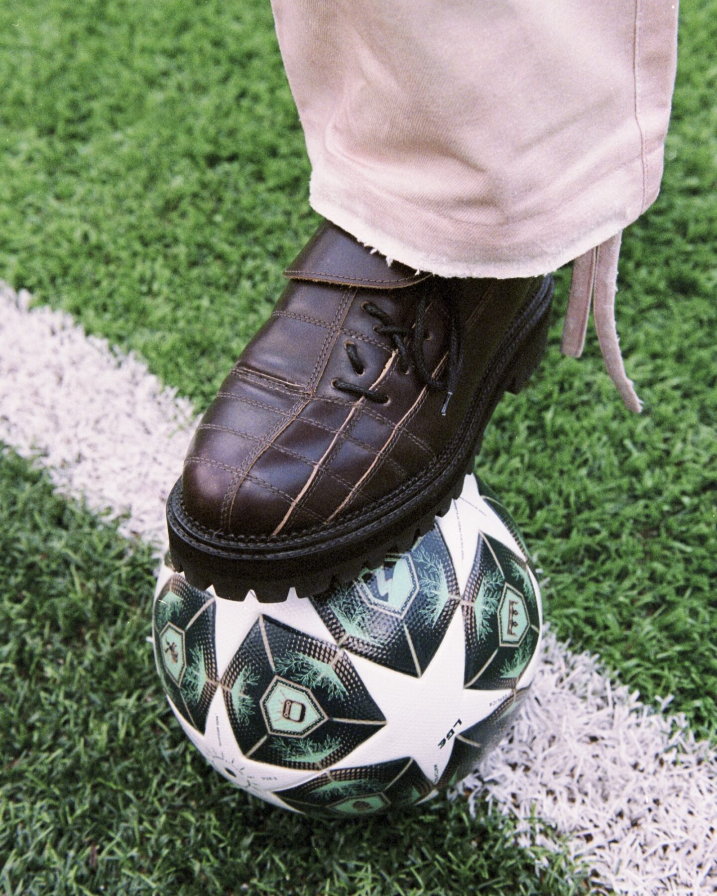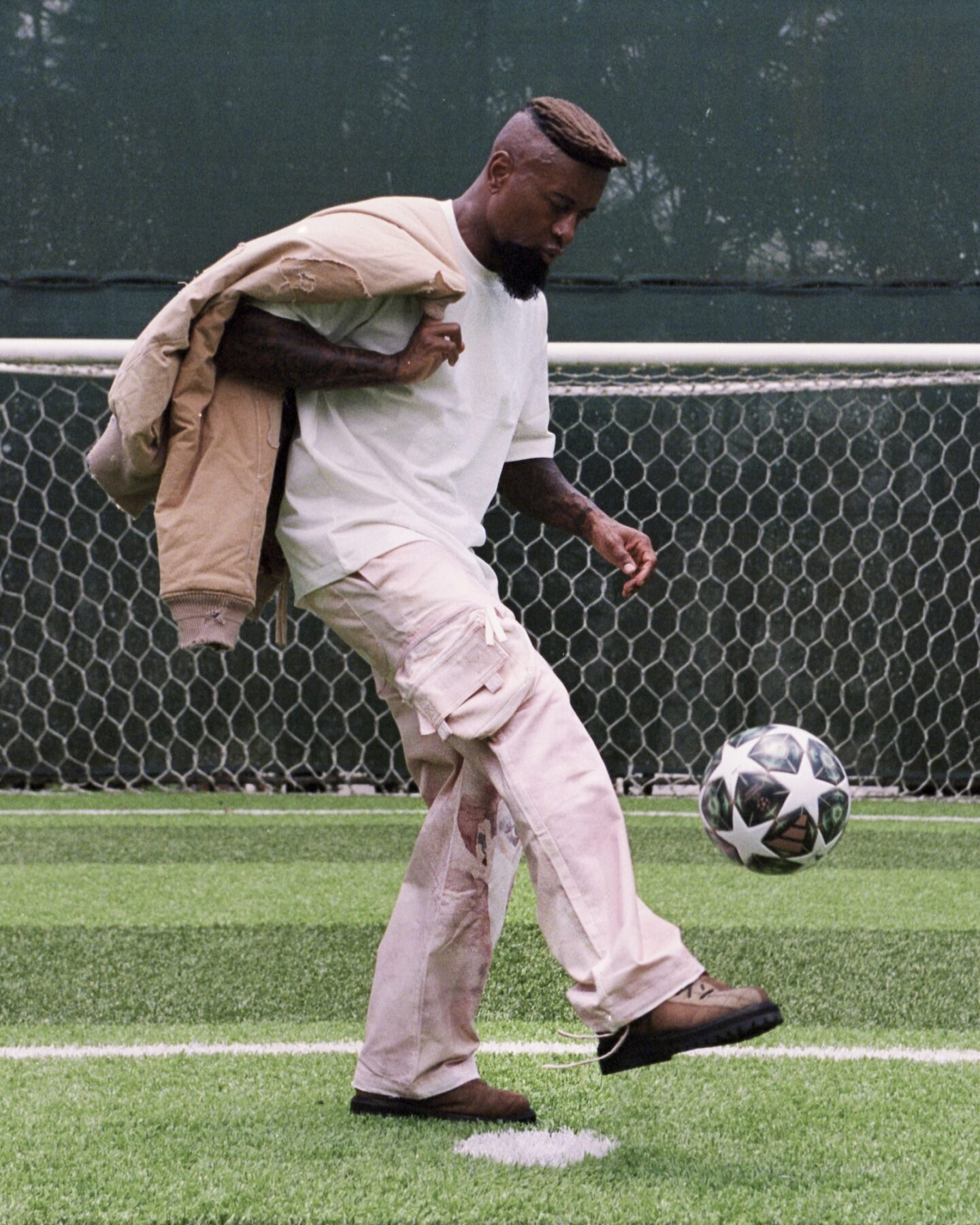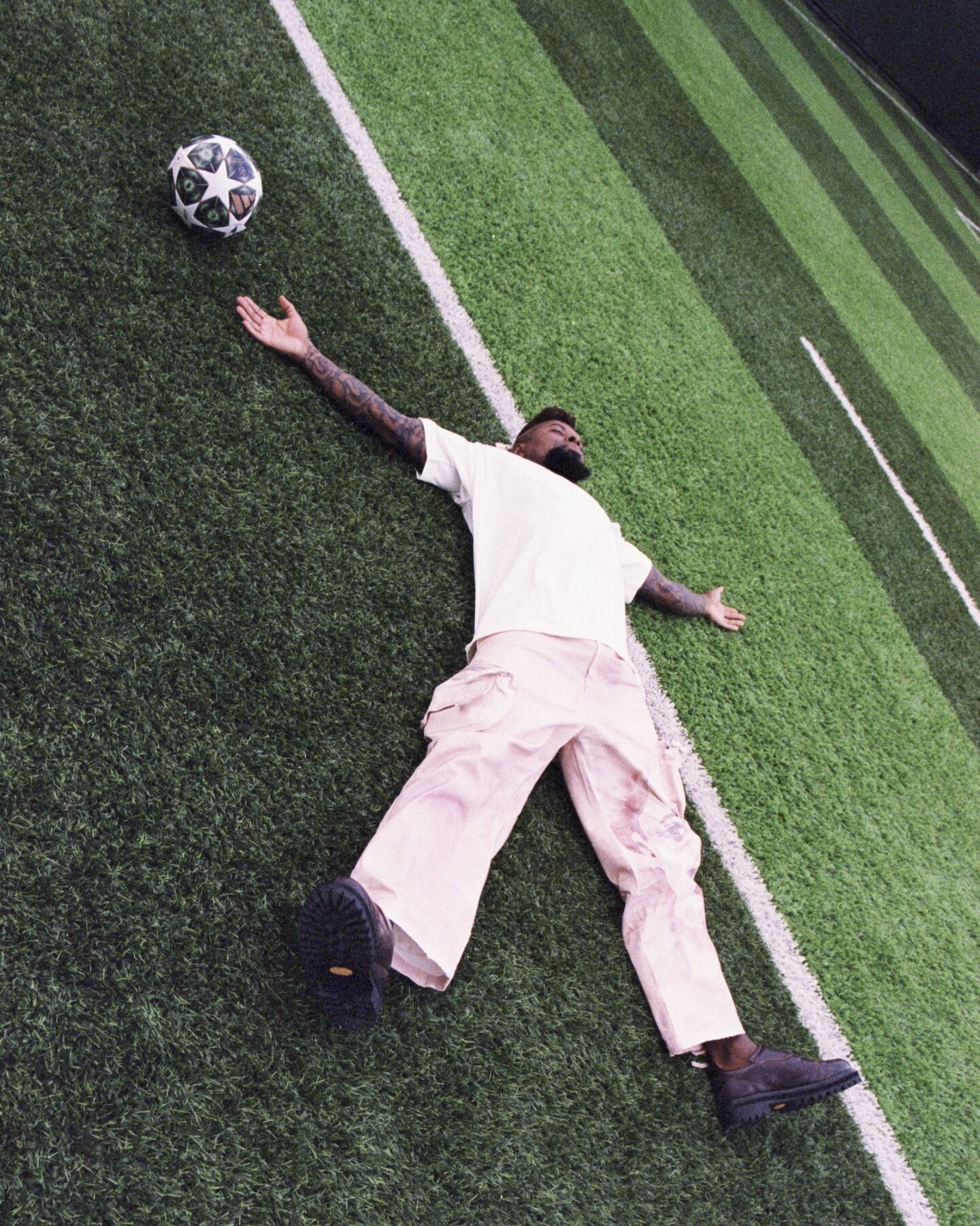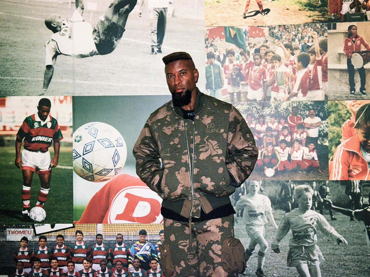 Por un lado, KidSuper aporta su inconfundible imaginario a la propuesta: ilustraciones pintadas a mano, rostros expresivos, patrones de camuflaje y una estética inspirada claramente en el fútbol y la cultura popular. Por otro, Piet despliega su técnica con algunas señas de identidad muy reconocibles: crochet, tejido 3D, construcciones bordadas y una gran obsesión por el detalle.