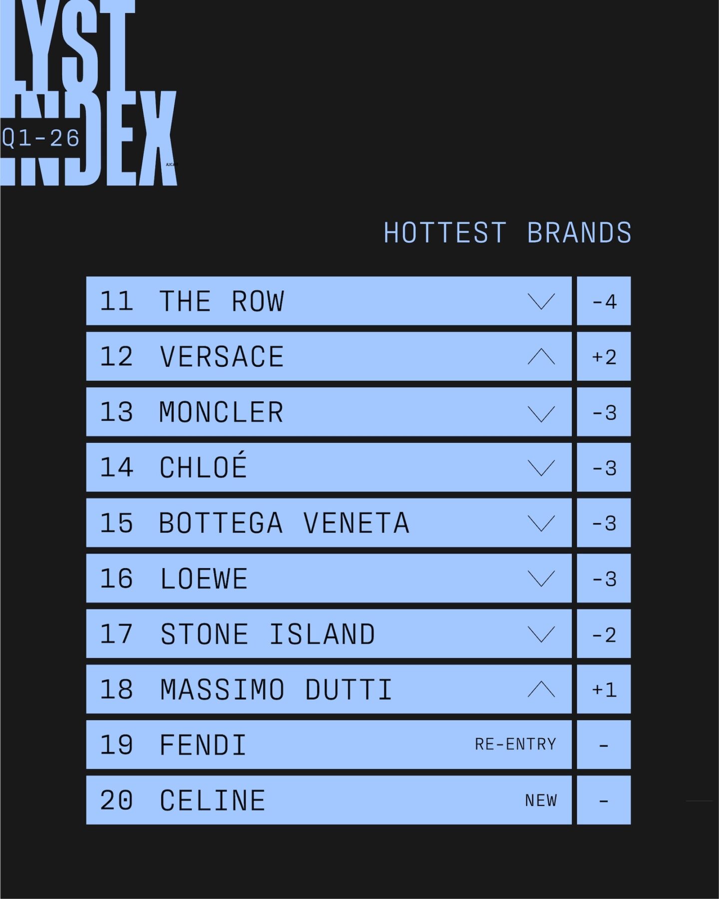 El ranking también registra nuevas entradas clave como la de Dior (3) y Celine (20), mientras que Fendi regresa al puesto 19. Versace gana impulso (+17% de demanda) en medio de cambios creativos, y marcas como COS o Massimo Dutti se mantienen firmes, demostrando que el quiet luxury sigue compitiéndo con los gigantes.