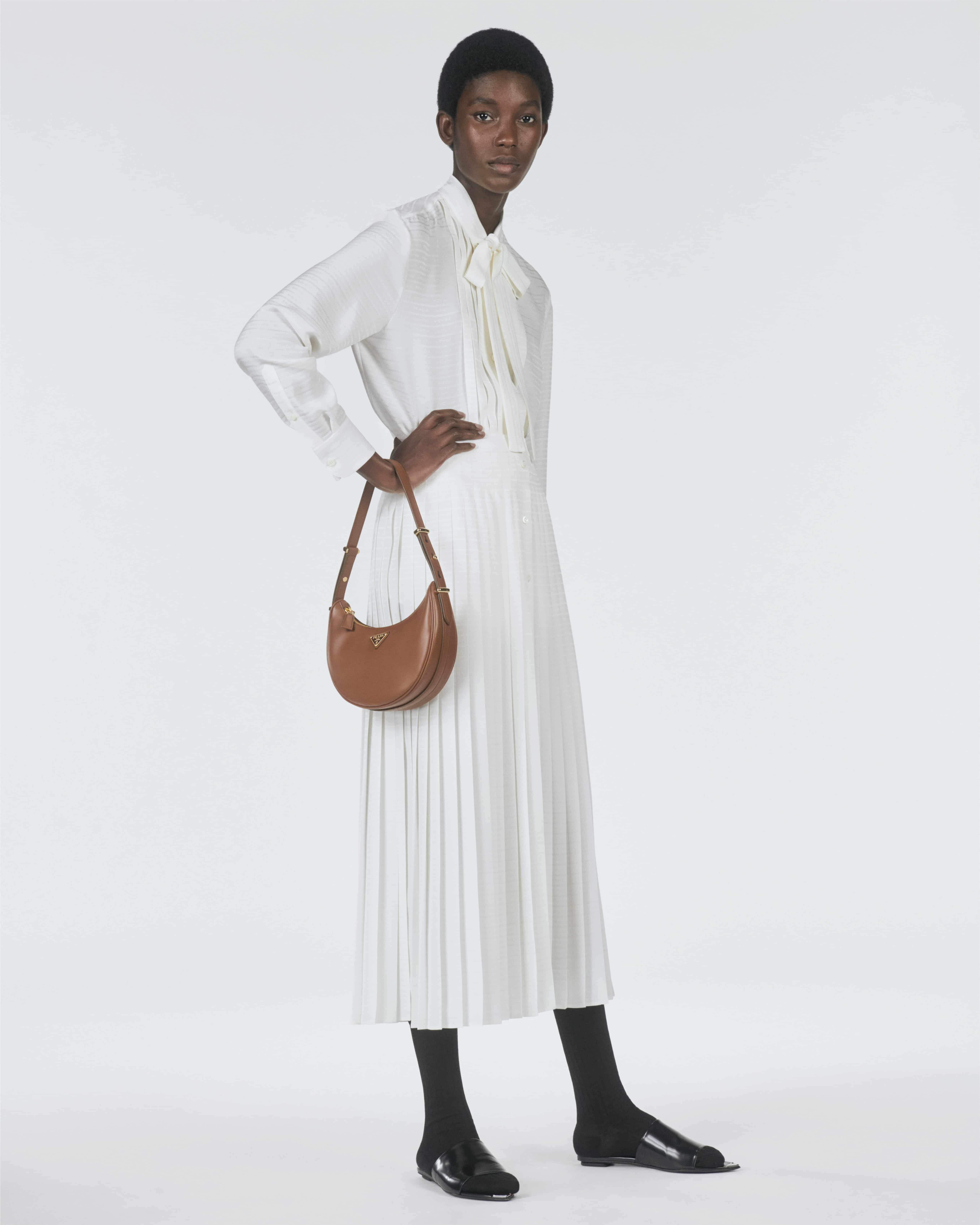 Los accesorios subrayan un ambiente de sofisticación fusionado con desenfado: laos zapatos de hombre son mocasines formales, para las mujeres: sandalias o alpargatas. Una gama de bolsos se desliza entre las distintas ocasiones: bolsos de rabia, juntos estilos Bauletto y tote en Antique Nappa y lujosa piel Daino, además del Prada Symbole. La nueva propuesta es un bolso en forma de media luna fabricada en suave piel de becerro.