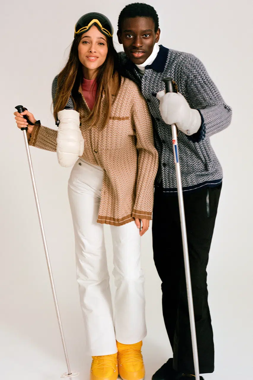 Inspirada en la estética de la ropa de esquí de las décadas de 1970 y 1980, la colección se basa en típicas siluetas de este deporte de nieve y las reinventa en cachemir para la temporada de invierno. Ski Lodge se compone de camisetas, prendas superpuestas y, por supuesto, prendas de punto.