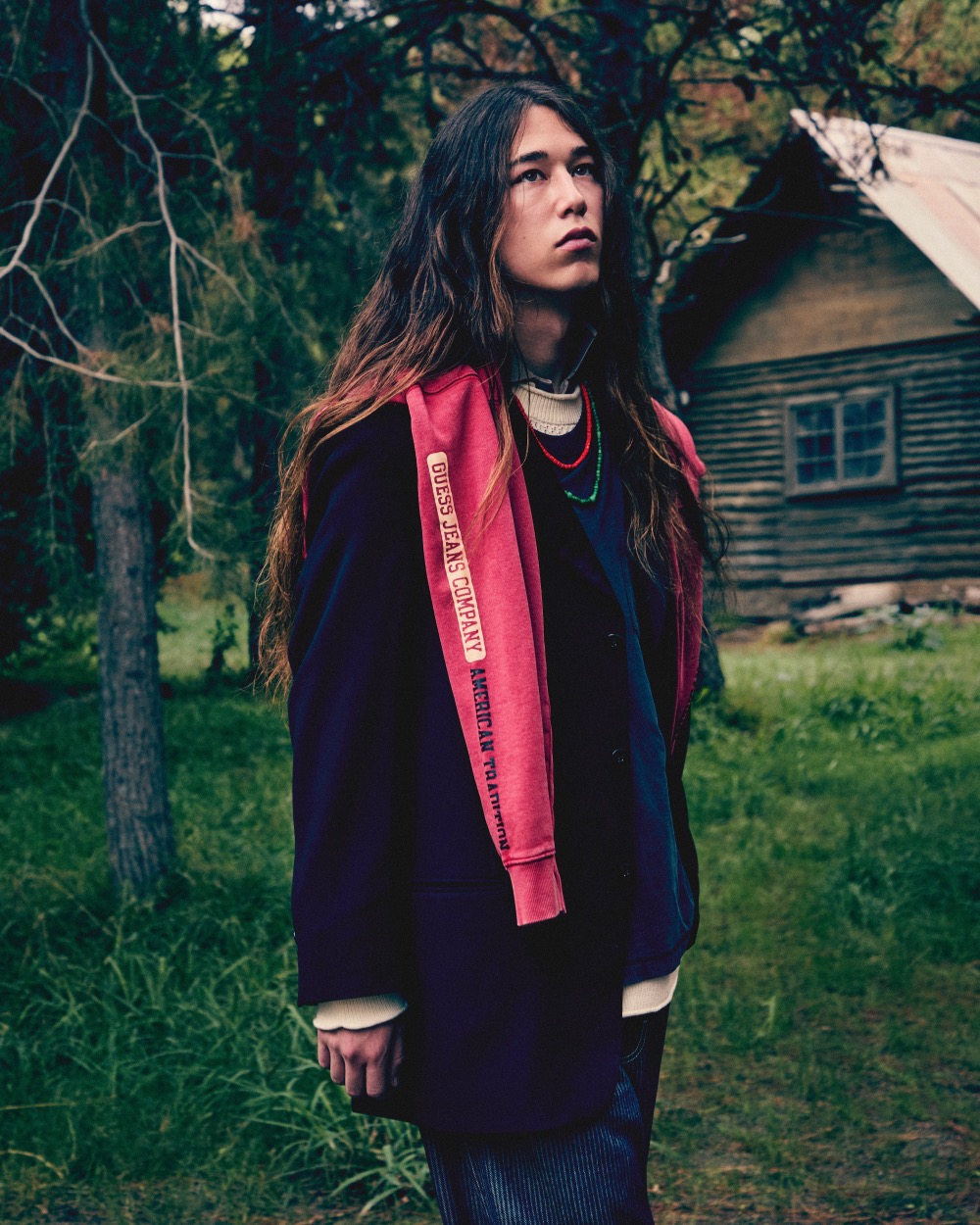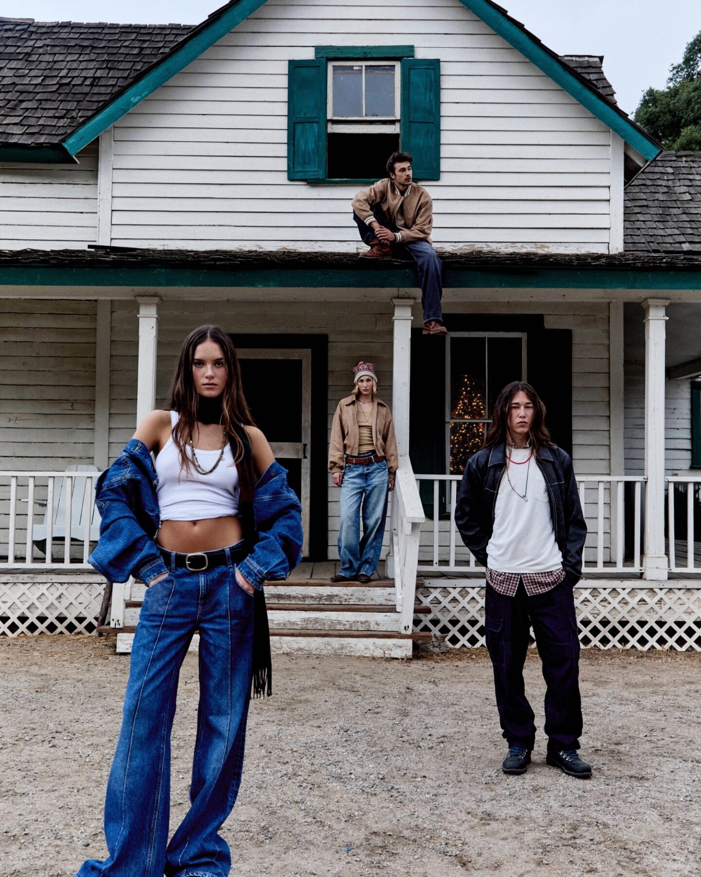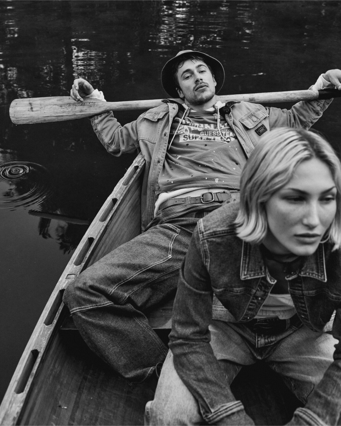 A campanha se passa em uma casa na montanha onde tudo acontece ao mesmo tempo: alguém está cozinhando, outra pessoa está tocando música, outra está rindo sem saber bem por quê. Festas reais, daquelas em que suas roupas acabam ficando com um cheiro de lareira e diversão. Nada está arrumado… e é por isso que funciona. A GUESS Jeans captura aquele caos lindo que transforma qualquer reunião em uma lembrança legal.