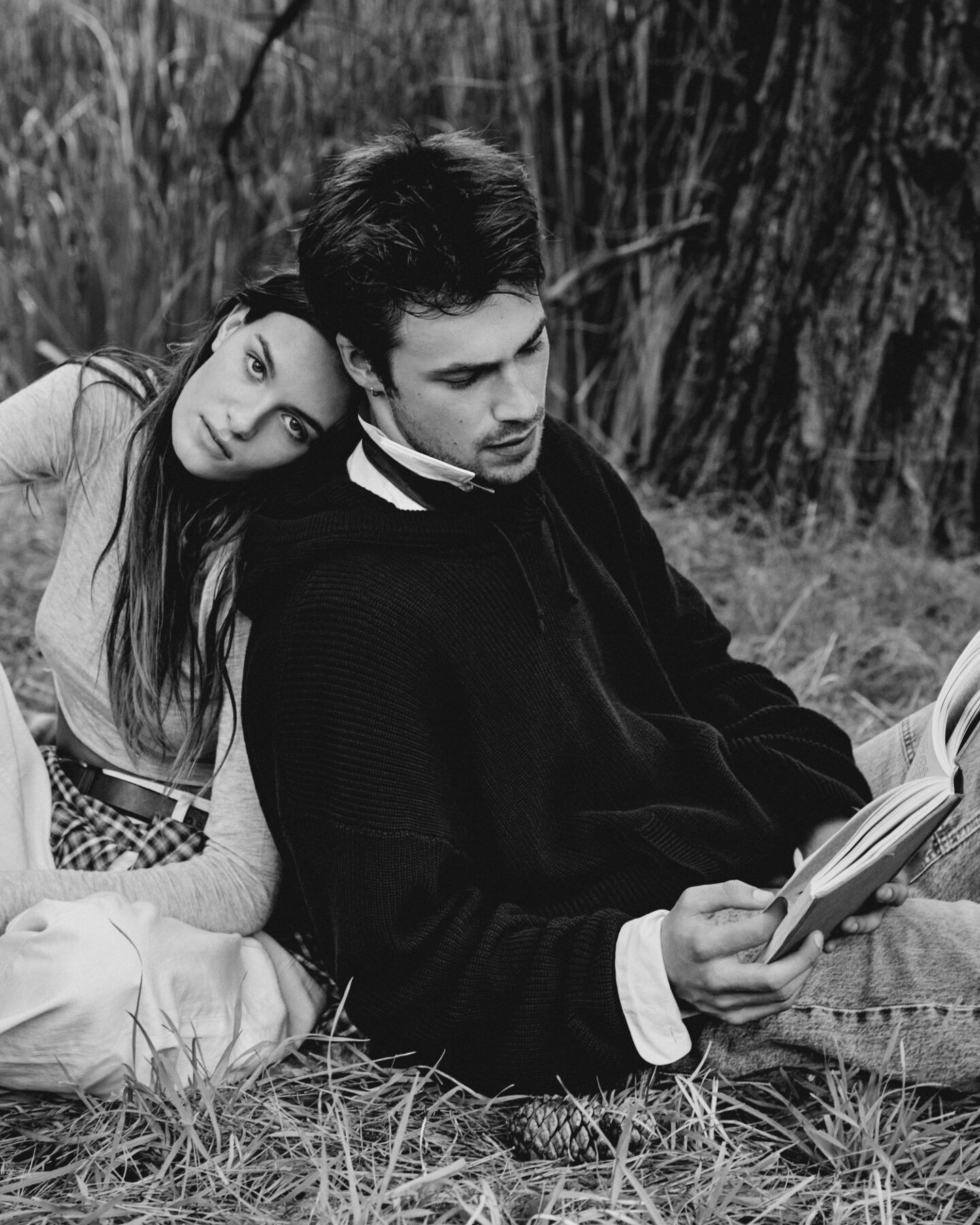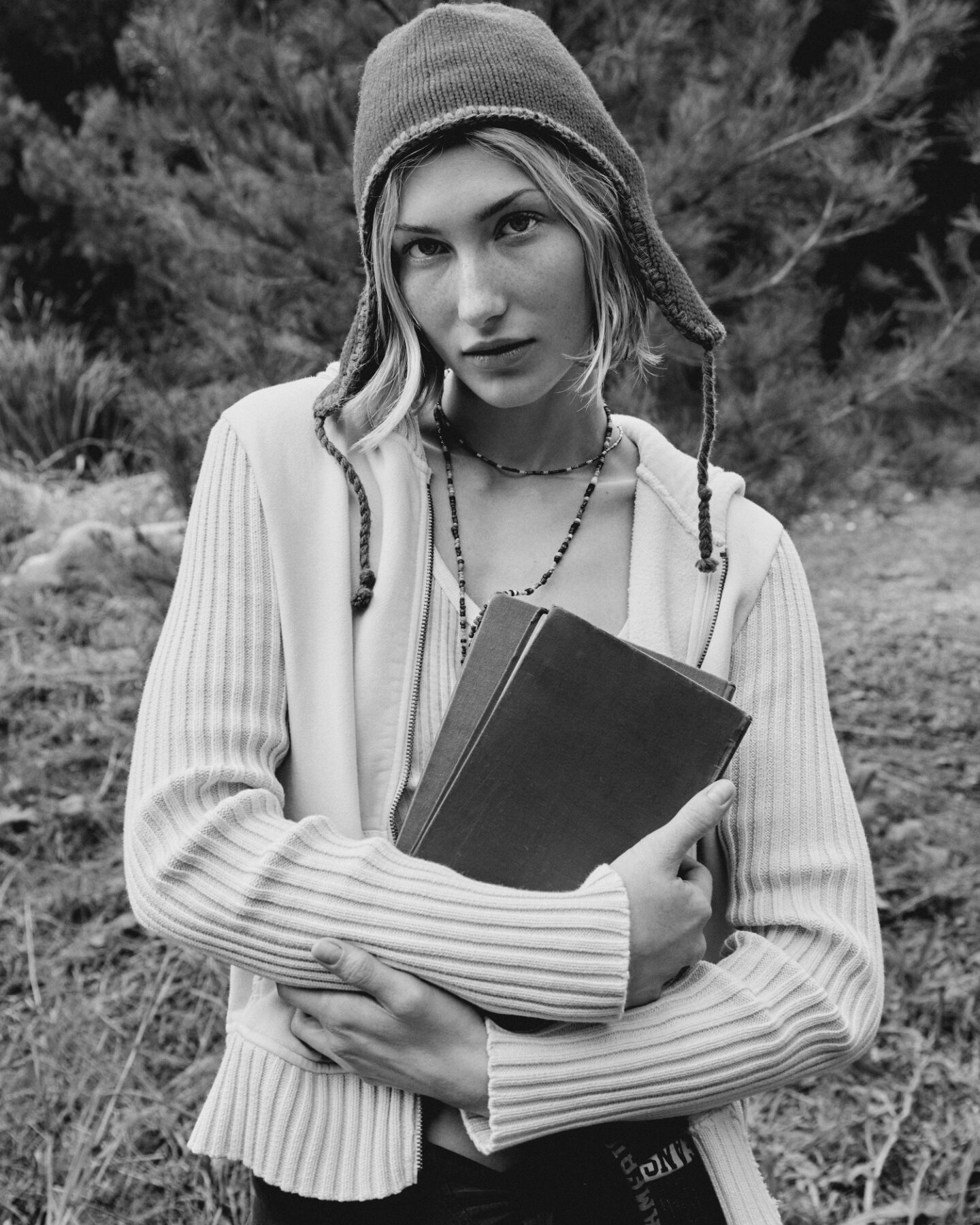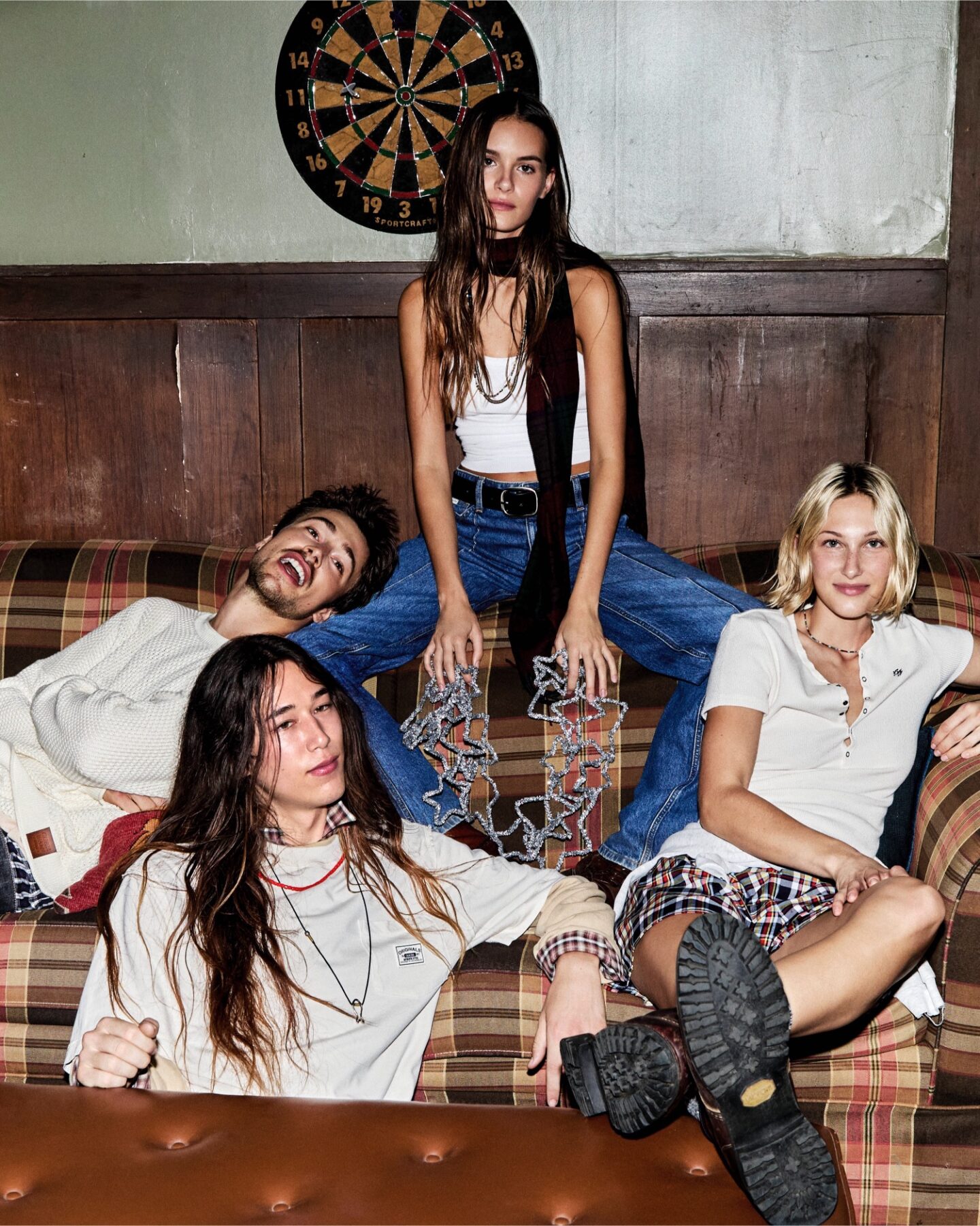 A coleção inspira-se nos anos 90, mas sem o cosplay. Denim solto que pede para ser movido, malhas oversized que parecem abraçar-te, xadrez que grita inverno sem melodrama, tops justos e botas resistentes o suficiente para atravessar qualquer ressaca emocional ou meteorológica. É a estética «vesti-me rapidamente, mas estou incrível». E esse é o verdadeiro feriado.