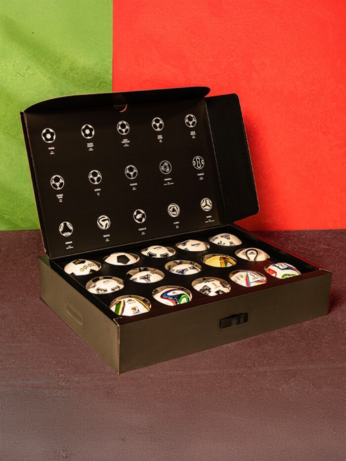 O set inclui desde a lendária Telstar do Mundial do México de 1970 até à nova Trionda, bola oficial para 2026. Cada coleção é apresentada numa caixa especial que mostra a evolução estética e tecnológica das bolas ao longo das décadas, sublinhando a influência da adidas na identidade do maior palco futebolístico do planeta.