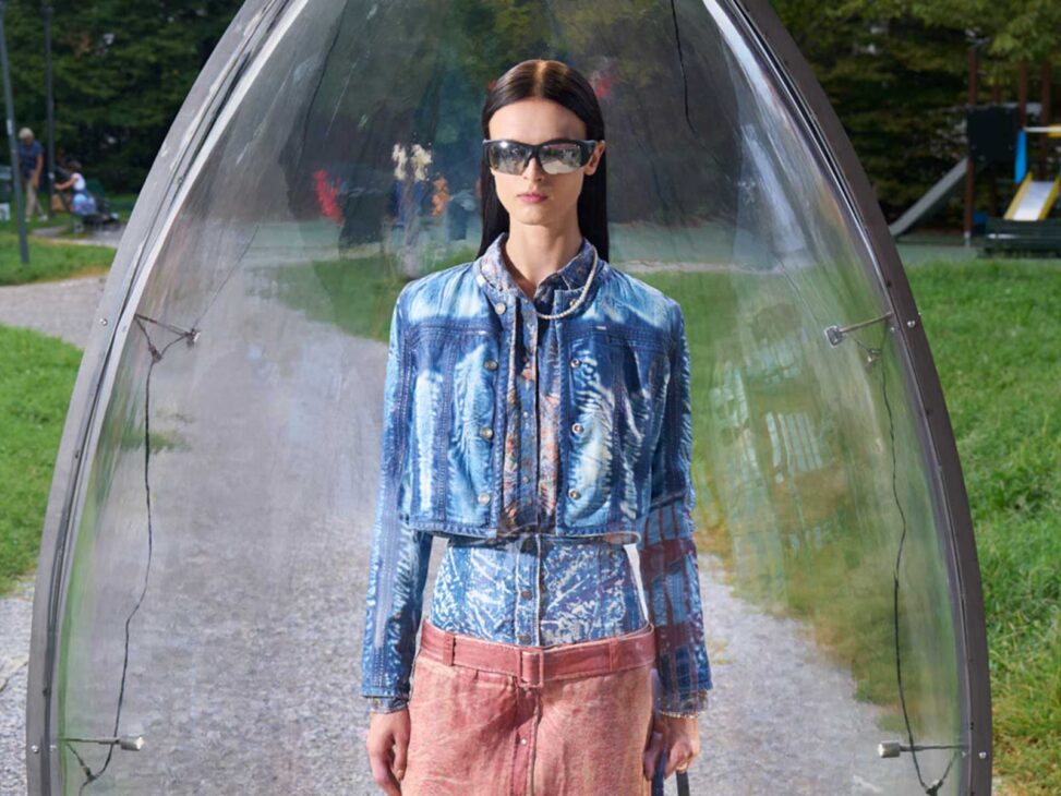 Numa temporada repleta de desfiles espetaculares, instalações conceituais e shows com ambições cinematográficas, a Diesel conseguiu, mais uma vez, alterar o eixo do espetáculo milanês. Para a sua coleção SS26, Glenn Martens não apresentou uma passarela. Não ofereceu uma fila A. Não montou uma fila da frente para editores, celebridades ou compradores VIP. O que ele fez foi — literalmente — espalhar a sua visão pelas ruas de Milão. Distribuiu 55 look eggs por toda a cidade: modelos reais, contidos em cápsulas de vidro transparente em forma de ovo, prontos para serem encontrados por qualquer pessoa. Porque a mensagem era tão clara quanto subversiva: «a moda é um jogo, mas um jogo em que todos podem participar».