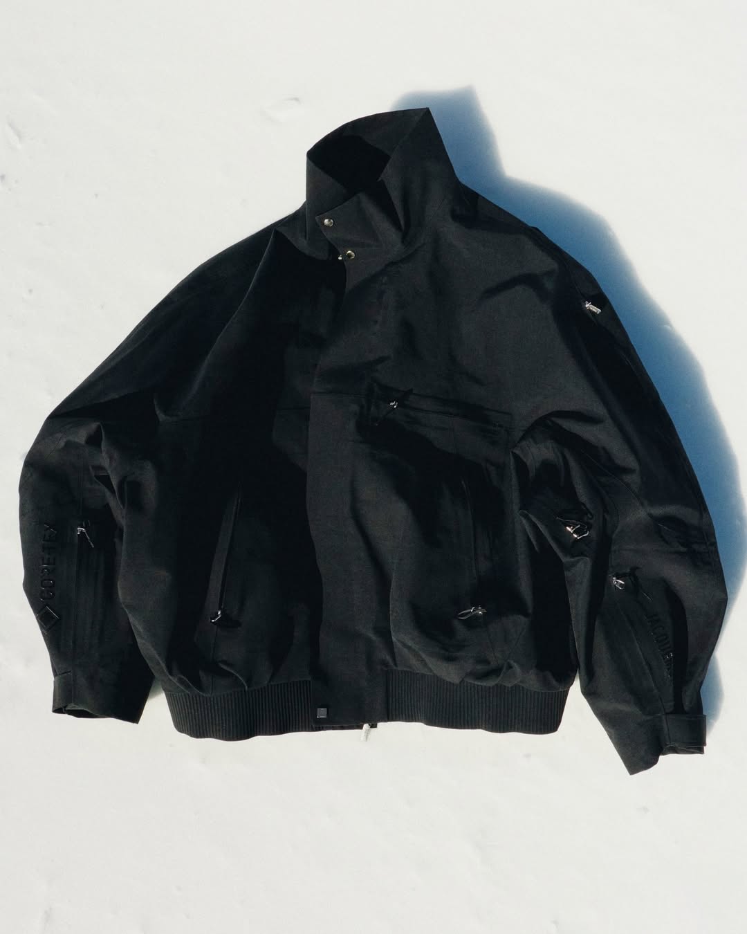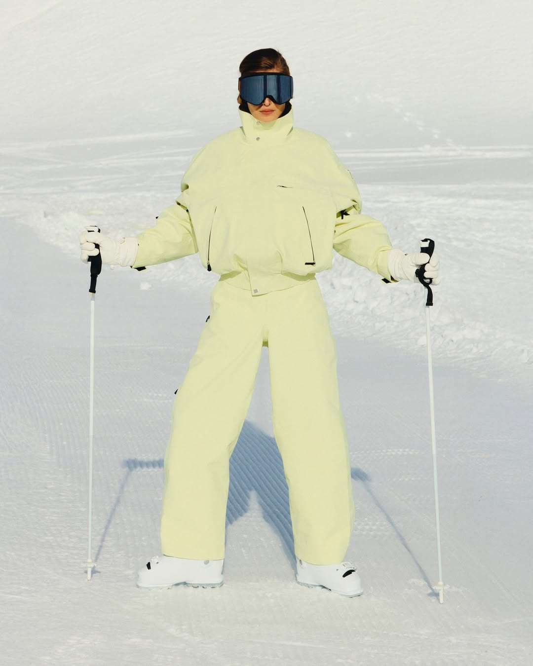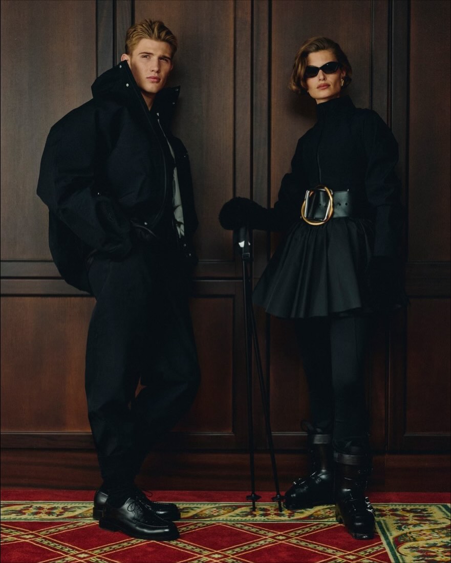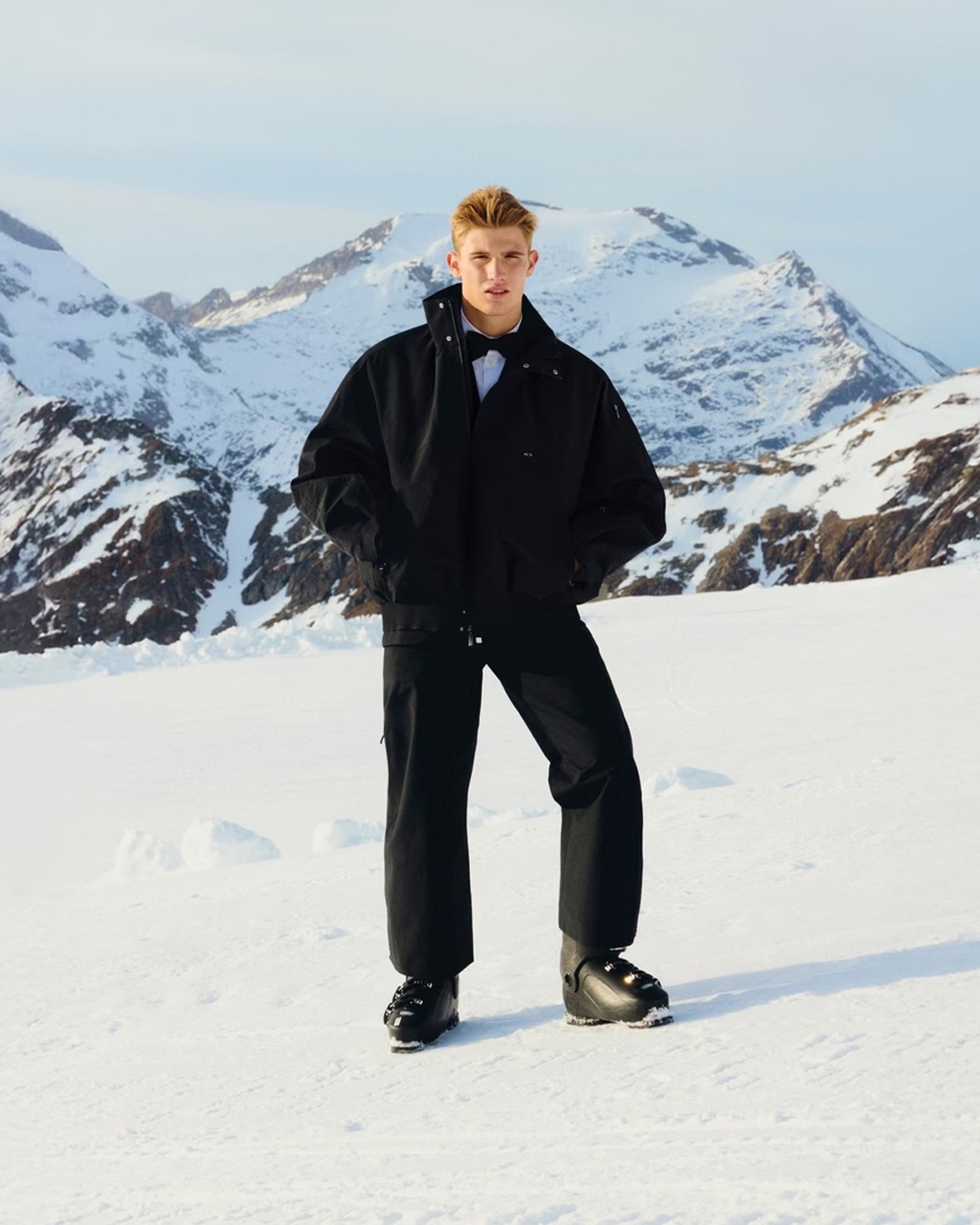 As imagens brincam com esse contraste. No interior, painéis de madeira, carpetes burguesas e uma estética preta sobre preta transformam as modelos em personagens de um filme rodado em St. Moritz. No exterior, luz gelada, neve infinita e peças de roupa que parecem cortar a paisagem como se tivessem sido feitas para dominá-la. Os macacões justos refinam o corpo numa linha aerodinâmica; as parkas com ombros largos têm aquele exagero ao estilo Jacquemus que faz pensar que também funcionariam na rua; e os óculos técnicos são pura energia para evitar a celebridade, perfeitos para esquiar, mas também para desviar dos flashes.