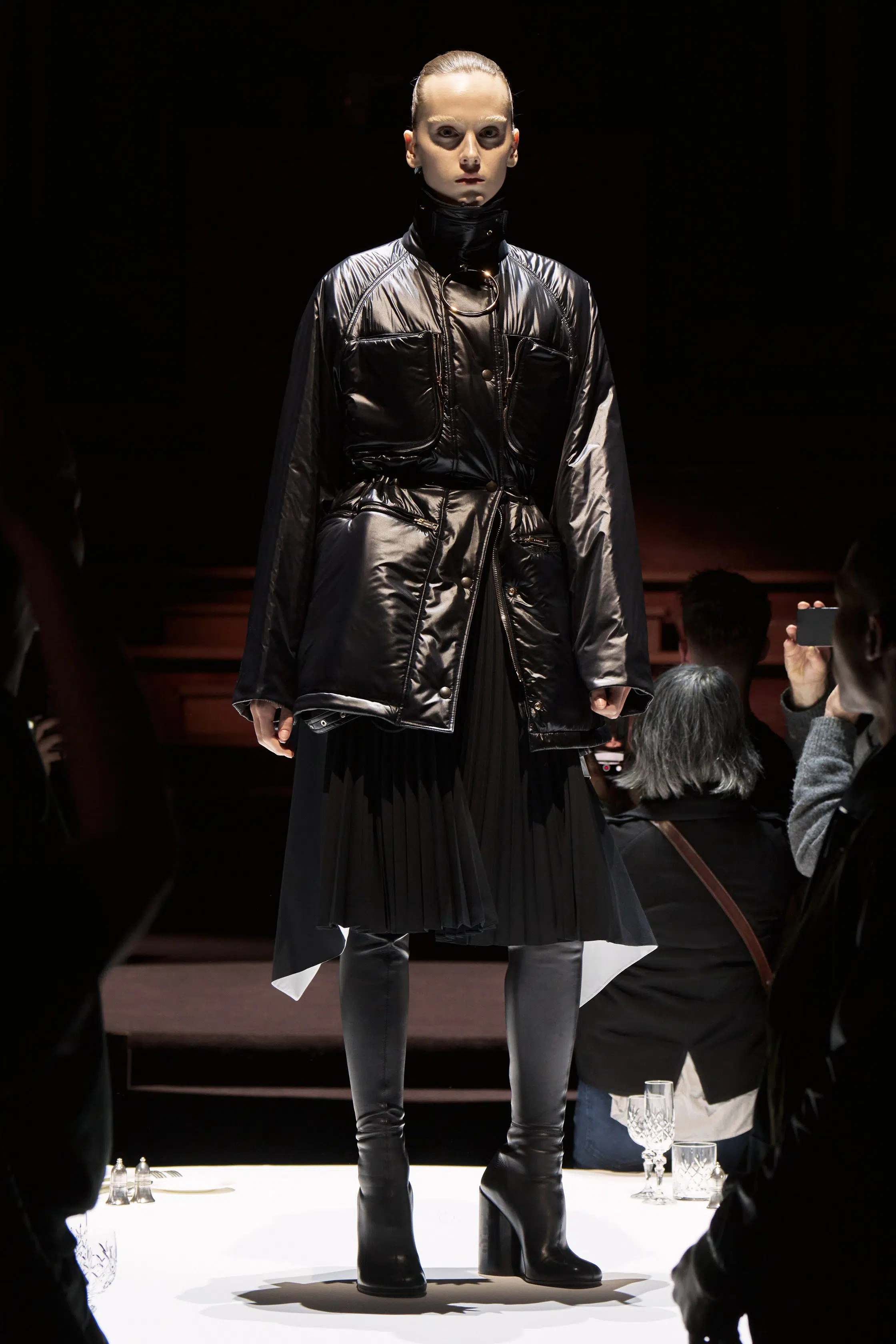 No hubo ningún error, aparentemente obvio, todo lo que escuchamos fueron aplausos y más aplausos por la reimaginación que Riccardo hizo de los archivos de Burberry. Las chaquetas acolchadas que llevaban nuestros abuelos de pequeños se convirtieron en vestidos, las gabardinas tomaron diferentes direcciones, a cada cual más interesante (ojo a los vestidos con esta forma), los caballos que la marca tenía como logo fueron rescatados y volvieron a ser protagonistas, esta vez en pedrería y bordados a mano, como vimos en la bomber gris y en la rosa combinada con un jersey a juego y una falda plisada del mismo color. Tampoco faltaron los habituales cuadros, en diferentes colores y versiones, ni la sastrería. Todos los looks se combinaron con botas altas tipo malla en negro o nude.