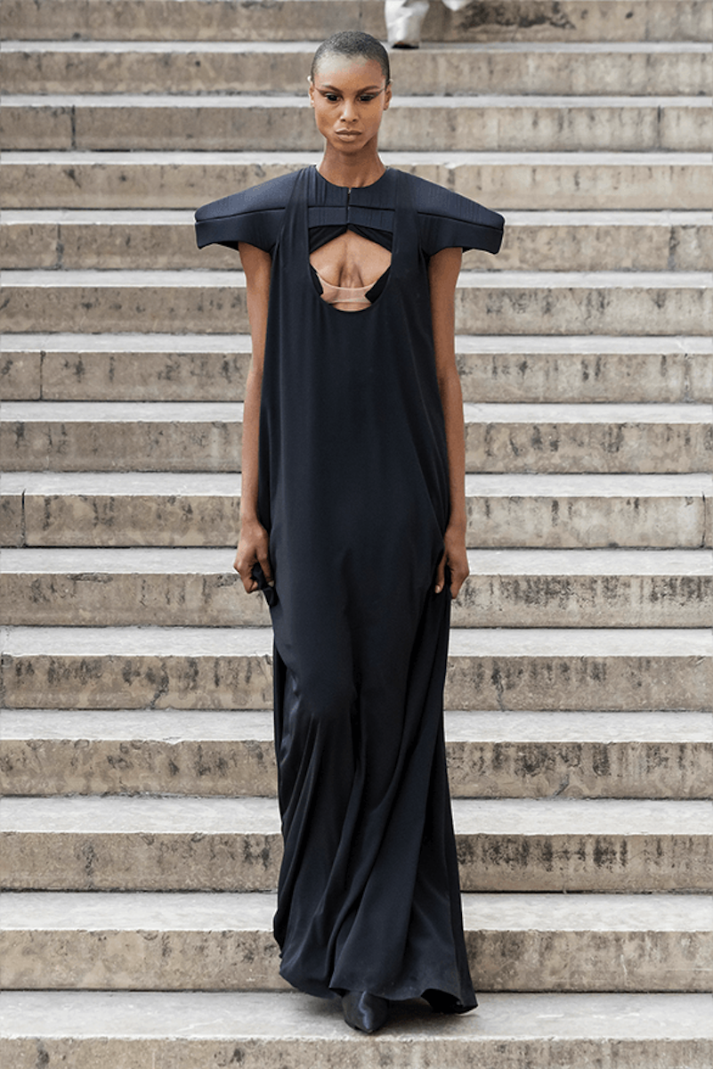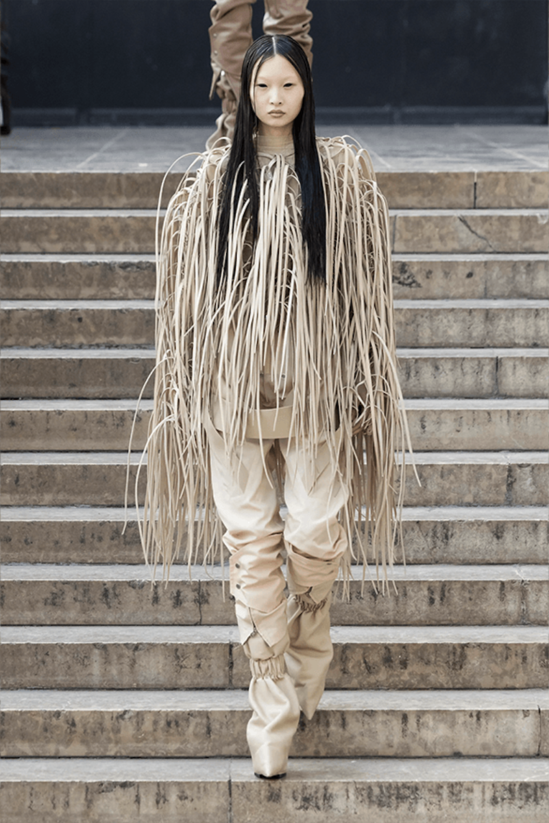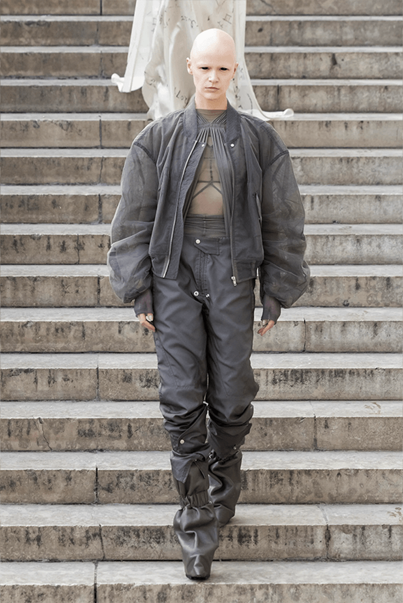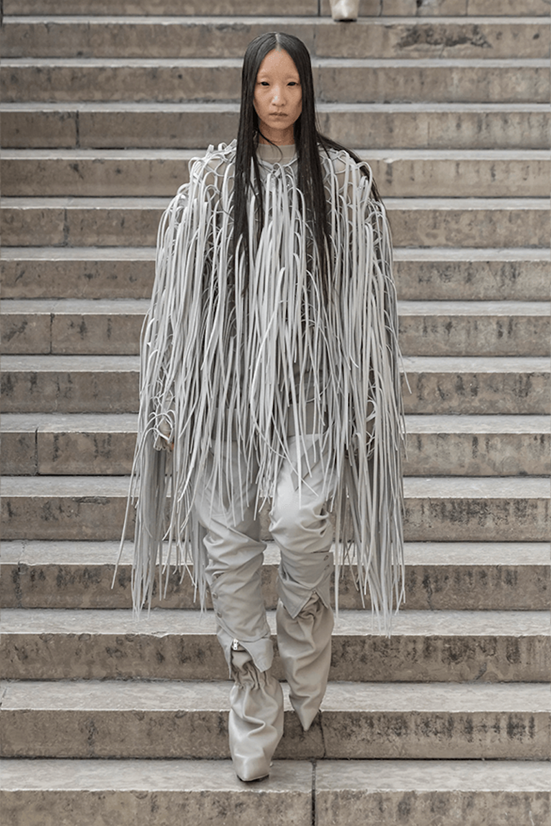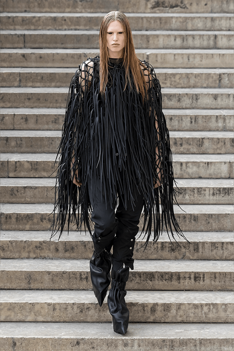 El diseñador unió de nuevo sus líneas masculina y femenina bajo un mismo lenguaje. Proporciones exageradas, materiales rígidos y una estética que combina agresividad y precisión definieron la propuesta. «Tough clothes for tough times», decía la nota del show.