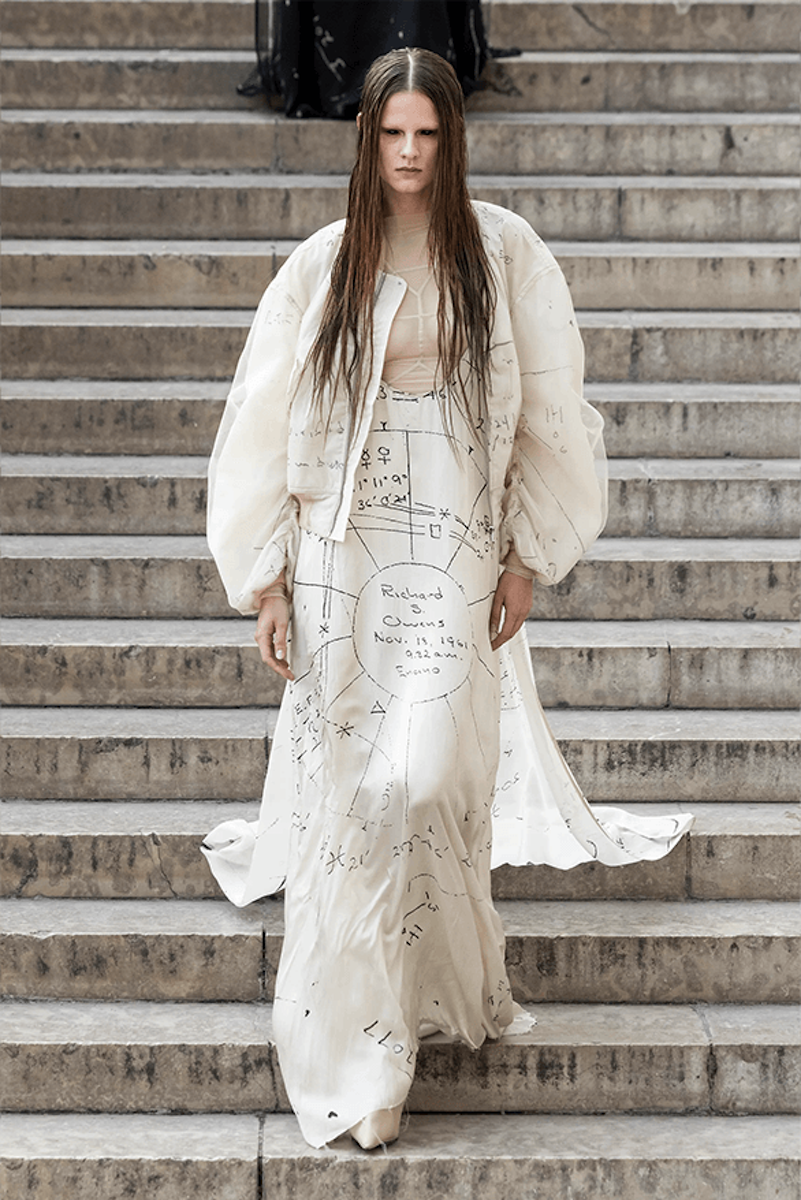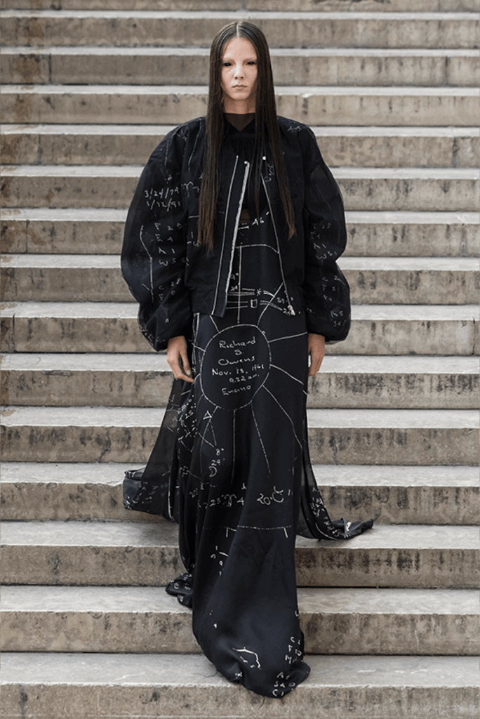 El cierre fue una pieza estampada con la carta natal del propio Owens. Funcionó como firma personal y conclusión simbólica del desfile. En conjunto, la colección confirma que su estética —oscura, estructurada y directa— sigue siendo una de las más coherentes del panorama actual.