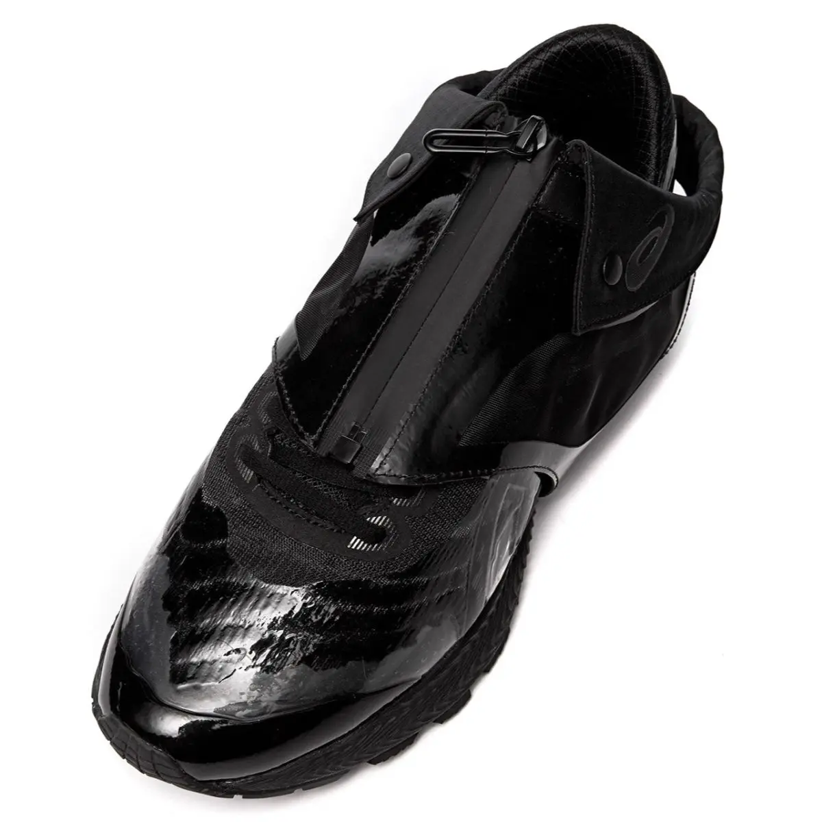 SHOOP x ASICS ha apostado por la iteración de un clásico: GEL-Nimbus 22. Presentada en la Semana de la Moda de Londres, la silueta se presenta en negro monocromático a base de piezas textiles y acabados en piel. El elemento más atractivo ha sido la aportación de SHOOP tras diseñar un panel de ripstop que abraza el tobillo y se hunde en el talón. Han añadido también un sistema con cremallera en el empeine que envuelve la zapatilla. De este modo los clásicos cordones quedan ocultos bajo esta capa transparente con las costuras en charol.