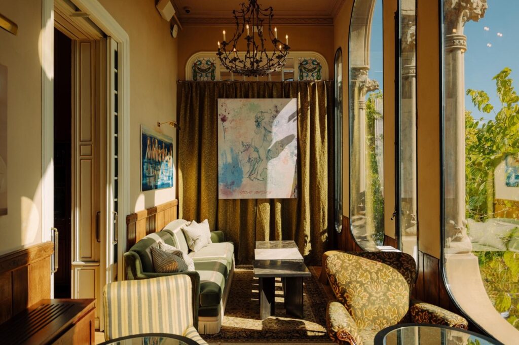 Los murales históricos preexistentes y los motivos decorativos pintados del edificio ofrecen un marco fascinante para estas obras contemporáneas. Varias piezas han sido comisionadas o seleccionadas para dialogar con las decoraciones originales de paredes y techos, como la serie Polifilia en papel de Eva Fàbregas en el salón, o las pinturas sobre lino doméstico de Iván Forcadell en el Fresco Bar.