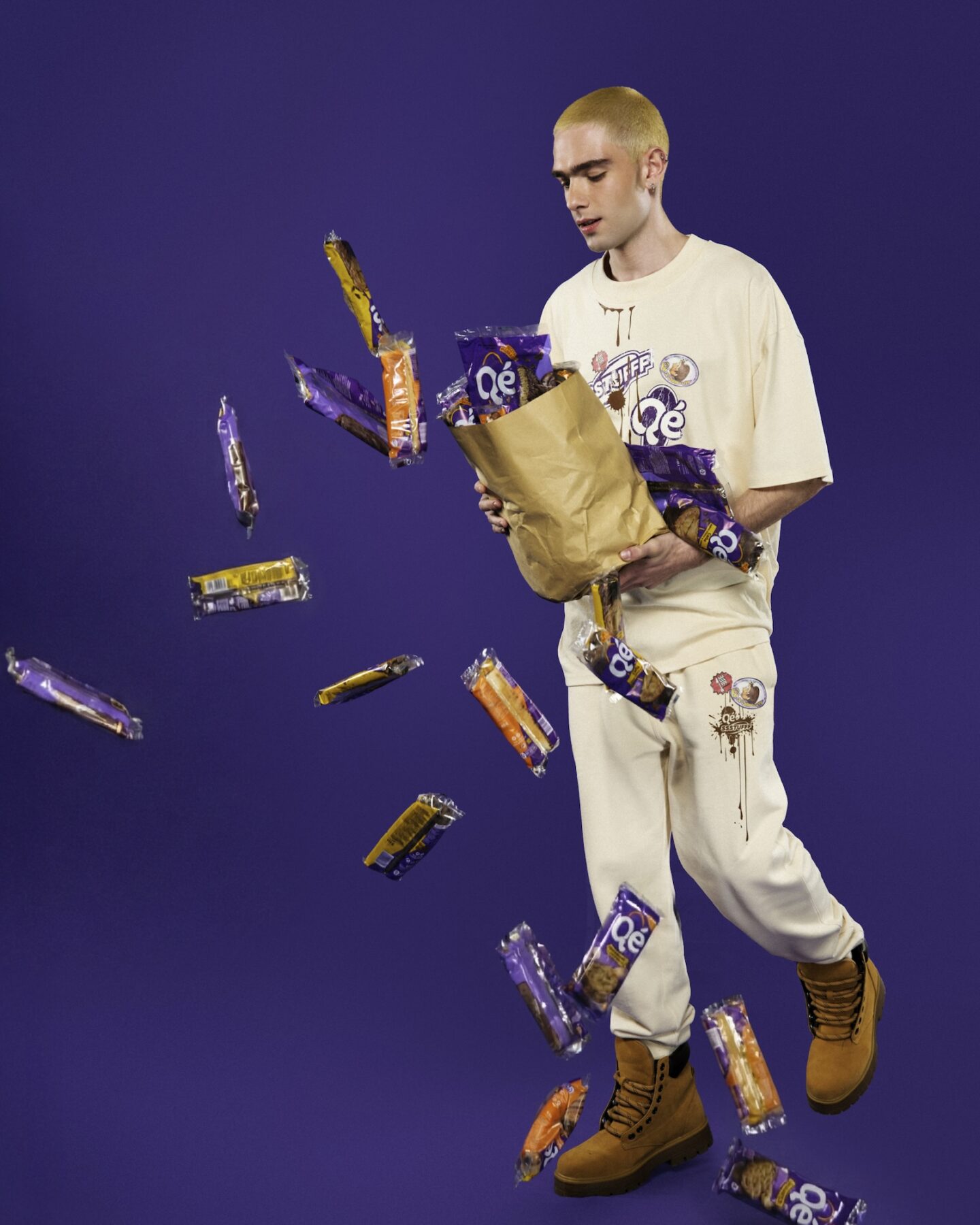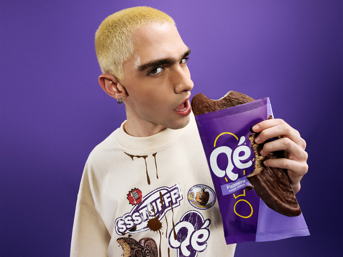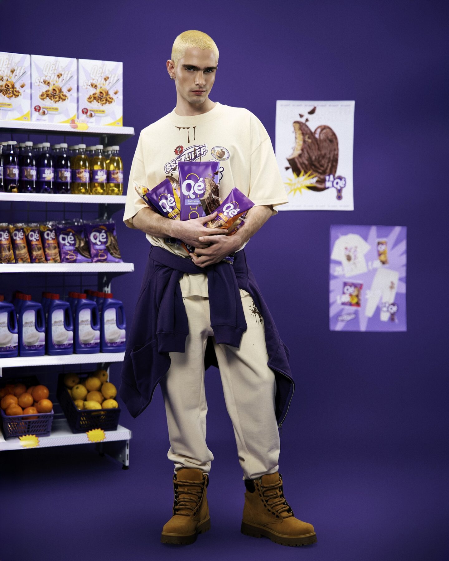 Si lo tuyo es la pulcritud y la perfección, esta noticia no va a ser de tu interés. Y es que SSSTUFFF y Qé!® acaban de convertir la mancha en el elemento protagonista indiscutible de su encuentro, ofreciendo un total look en total beige intervenido con grafismos, palmeras de chocolate y acentos morados en homenaje al icónico color púrpura de la marca de bollería. Una combinación que traduce el imaginario dulce y nostálgico al lenguaje del streetwear. Pura ironía, cultura pop y diversión.