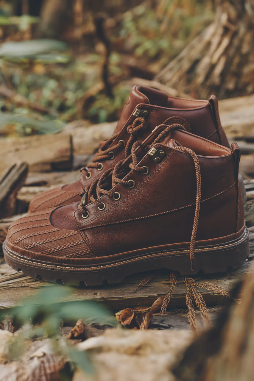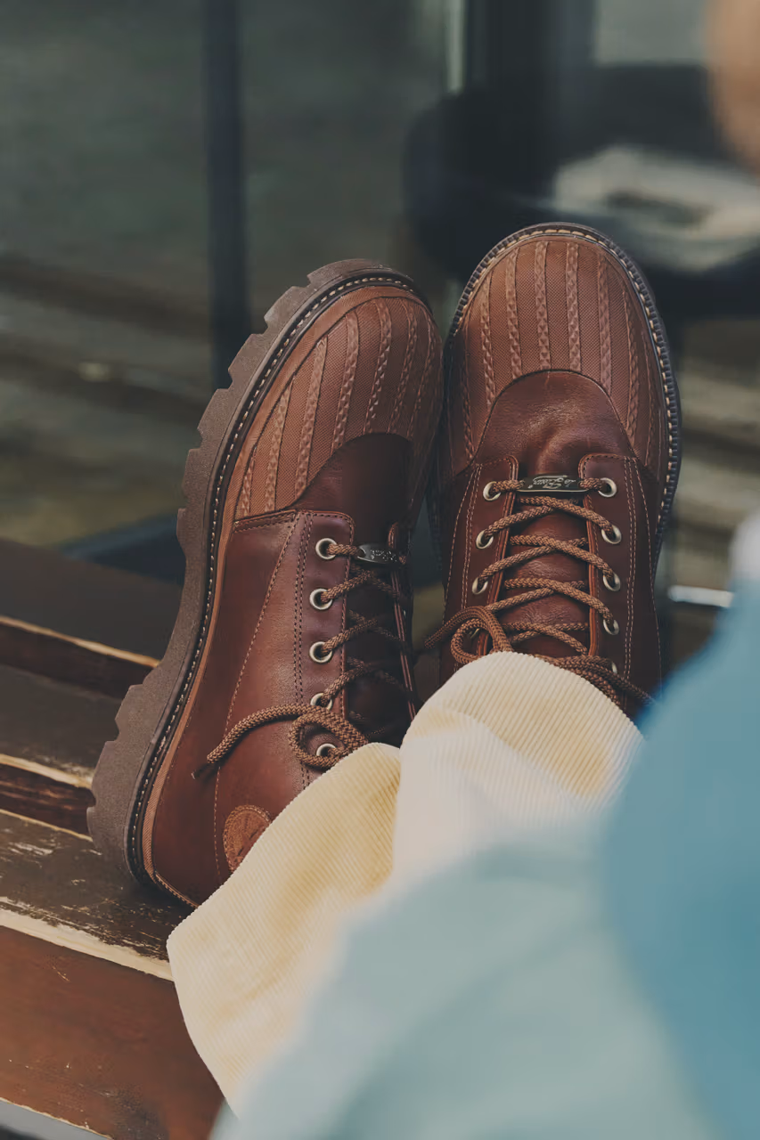 El diseño incorpora una suela lug con gran agarre. También incluye una puntera de goma moldeada con textura de diamante, cordones redondos, costuras tipo welt y herrajes metálicos. Estos detalles, junto con la marca especial de la colaboración, crean una mezcla equilibrada entre estilo clásico y toque actual.