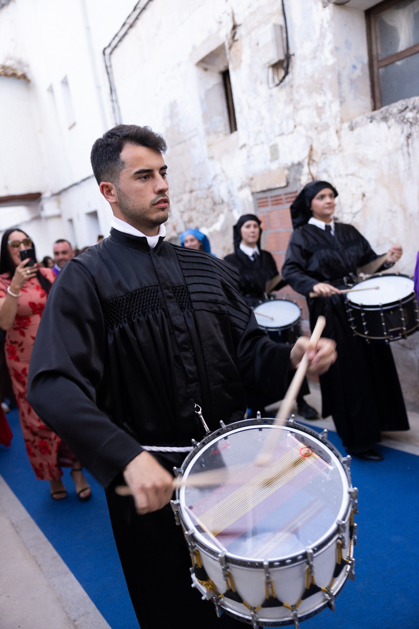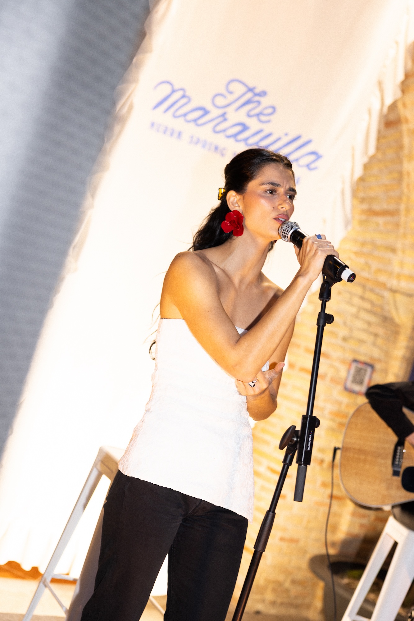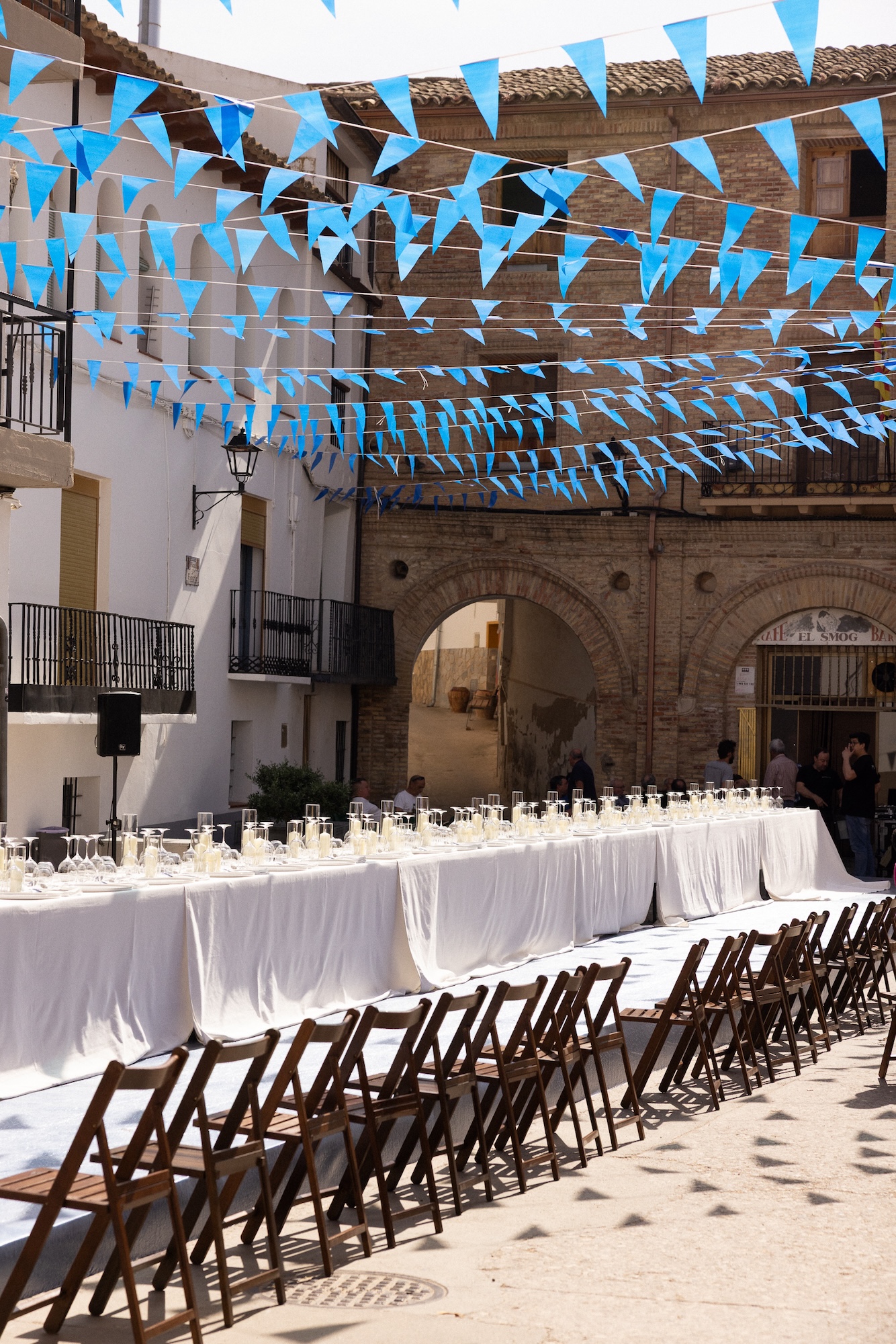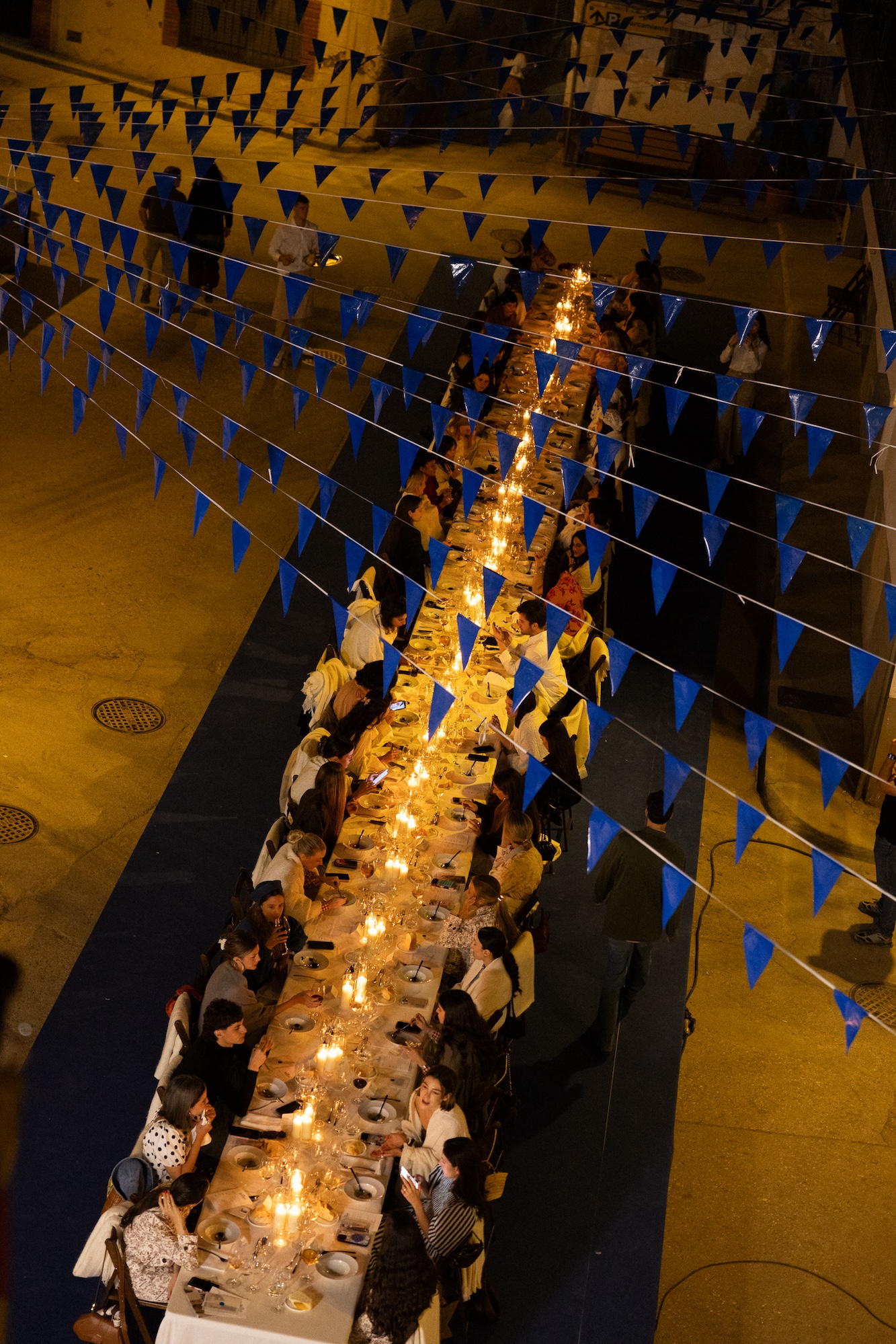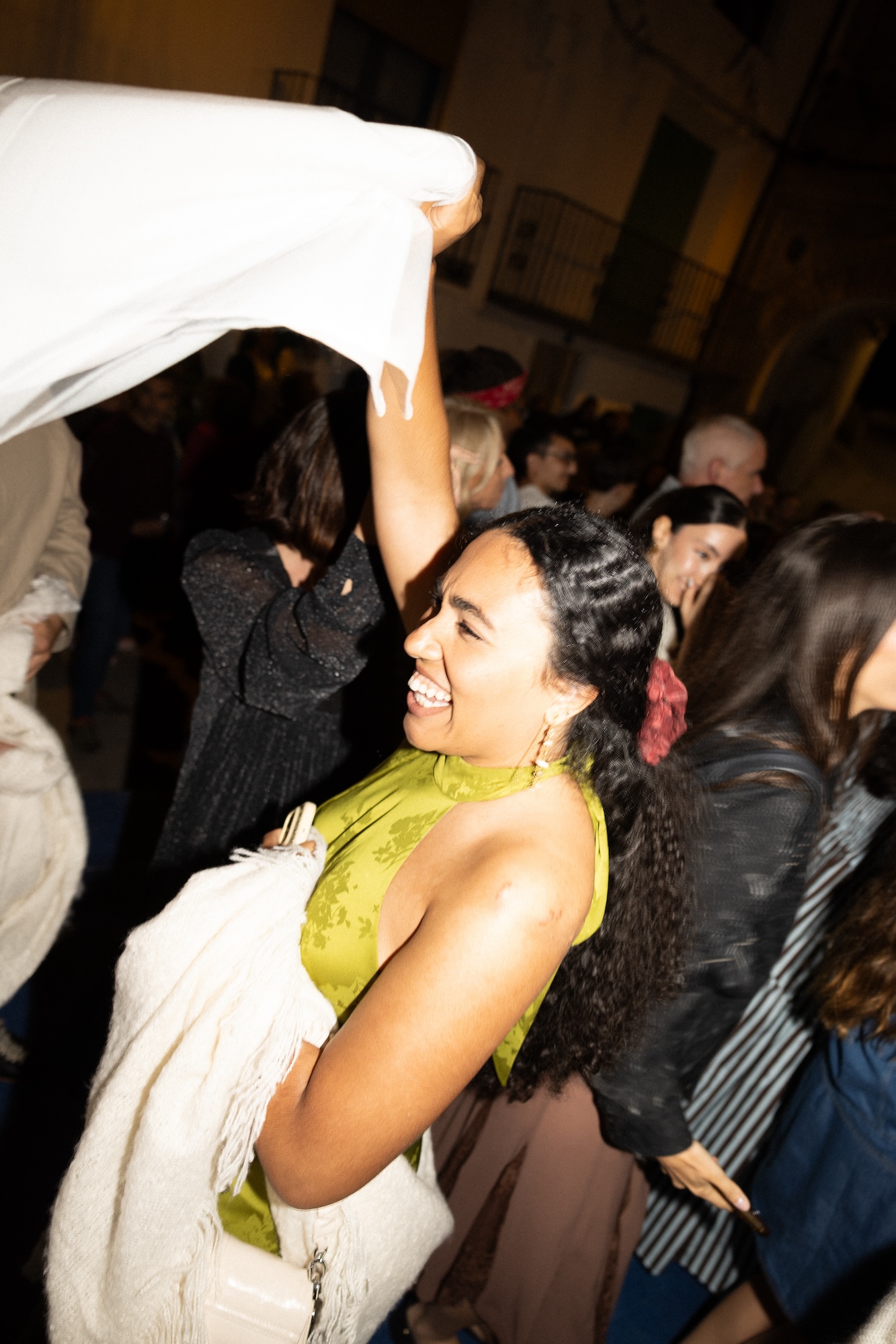 Fue justo después cuando irrumpió ante nosotros una tamborada tradicional, con el objetivo de guiarnos a otro de los enclaves más icónicos de Urrea de Gaén en una procesión que mezclaba moda y folclore, por supuesto. En la plaza del pueblo, la noche se abrió paso a nuevas emociones con un concierto íntimo de Bego Vargas, que nos deleitó con su acústico. Y al mismo tiempo, una mesa infinita para más de 100 invitados se abría paso justo el centro para acoger una cena donde pudimos degustar lo mejor de la gastronomía aragonesa desde una perspectiva actual.