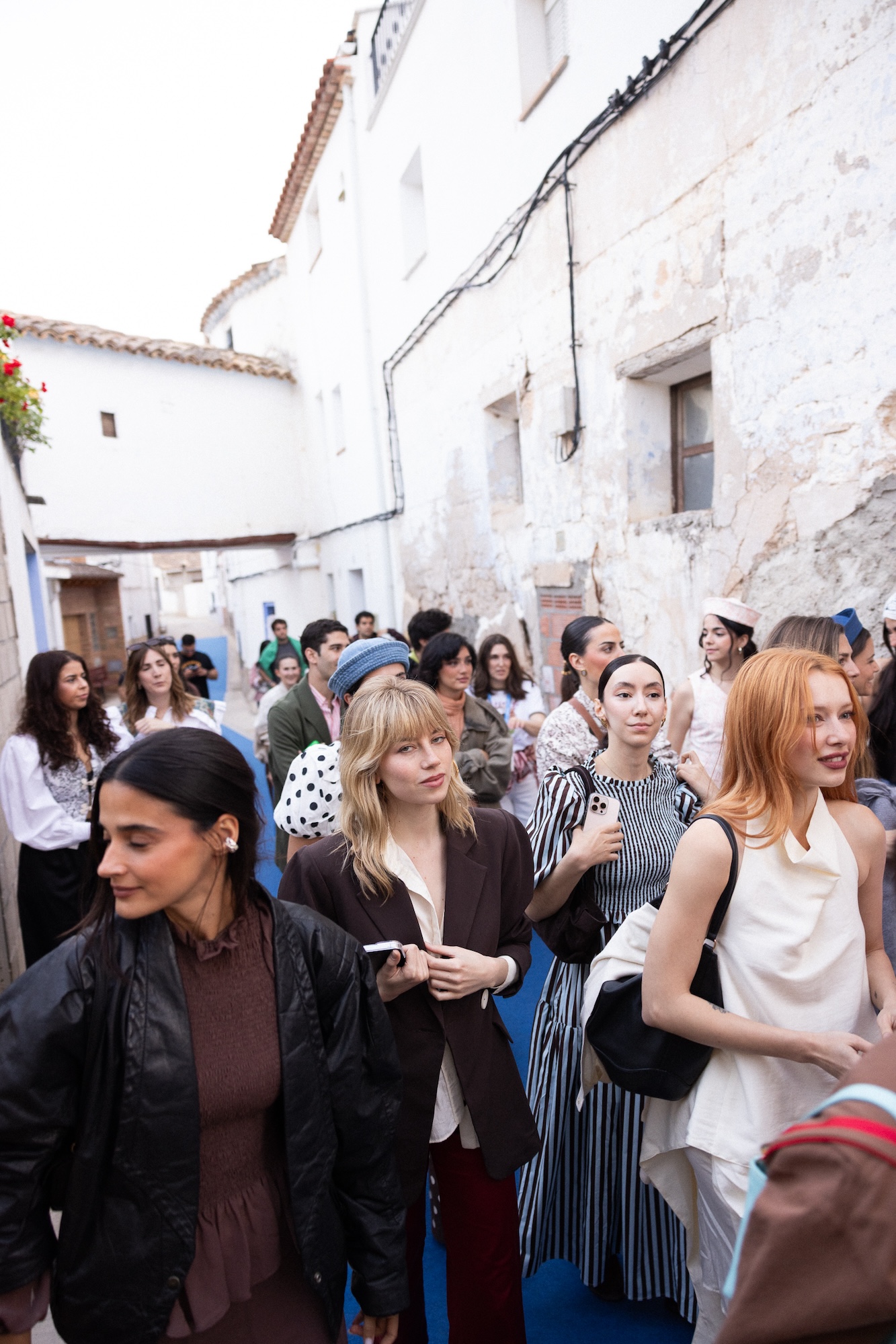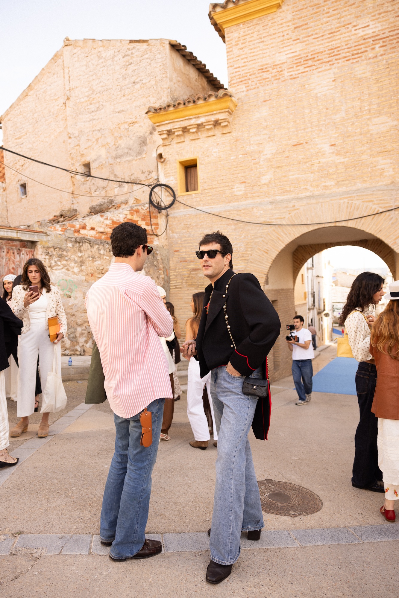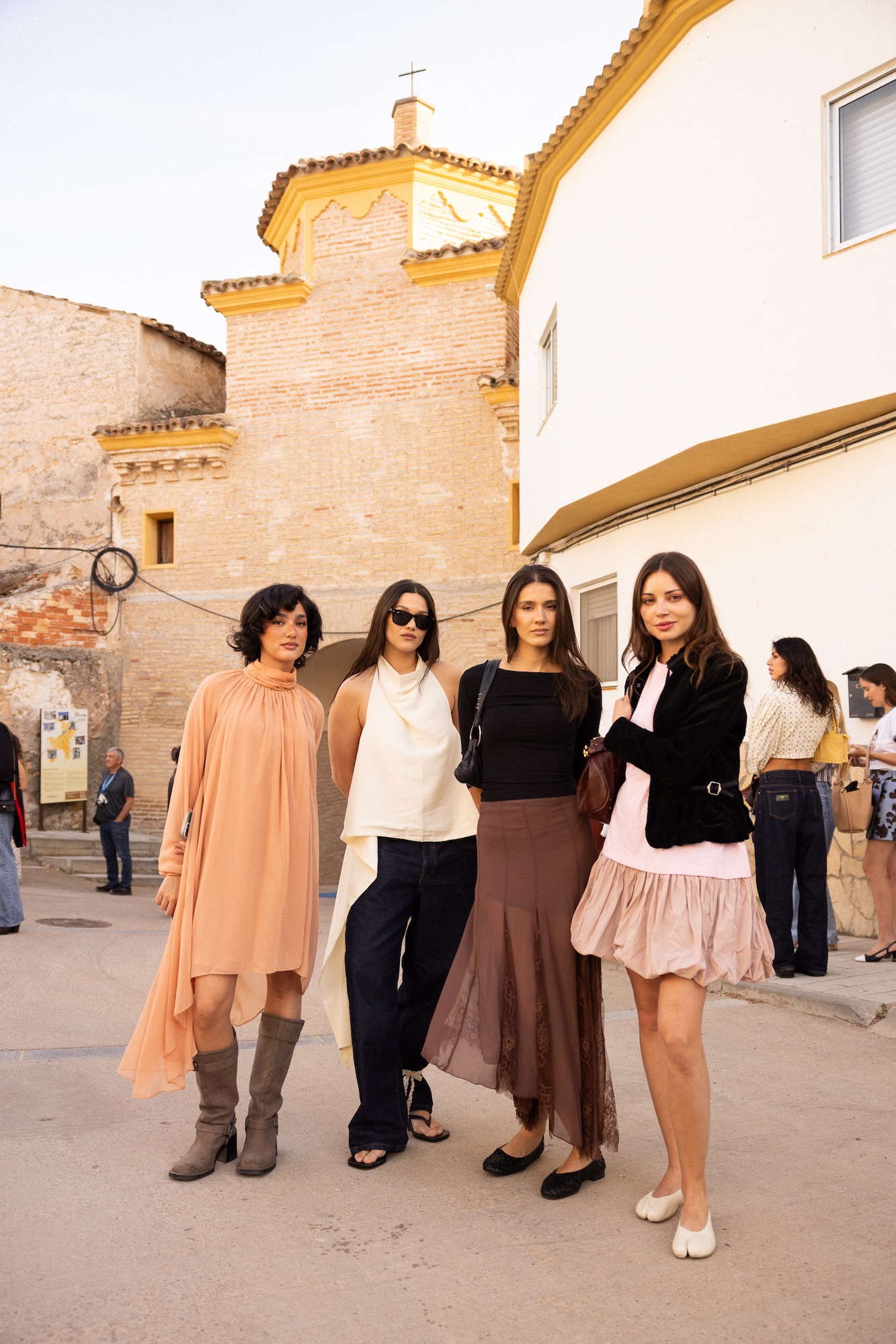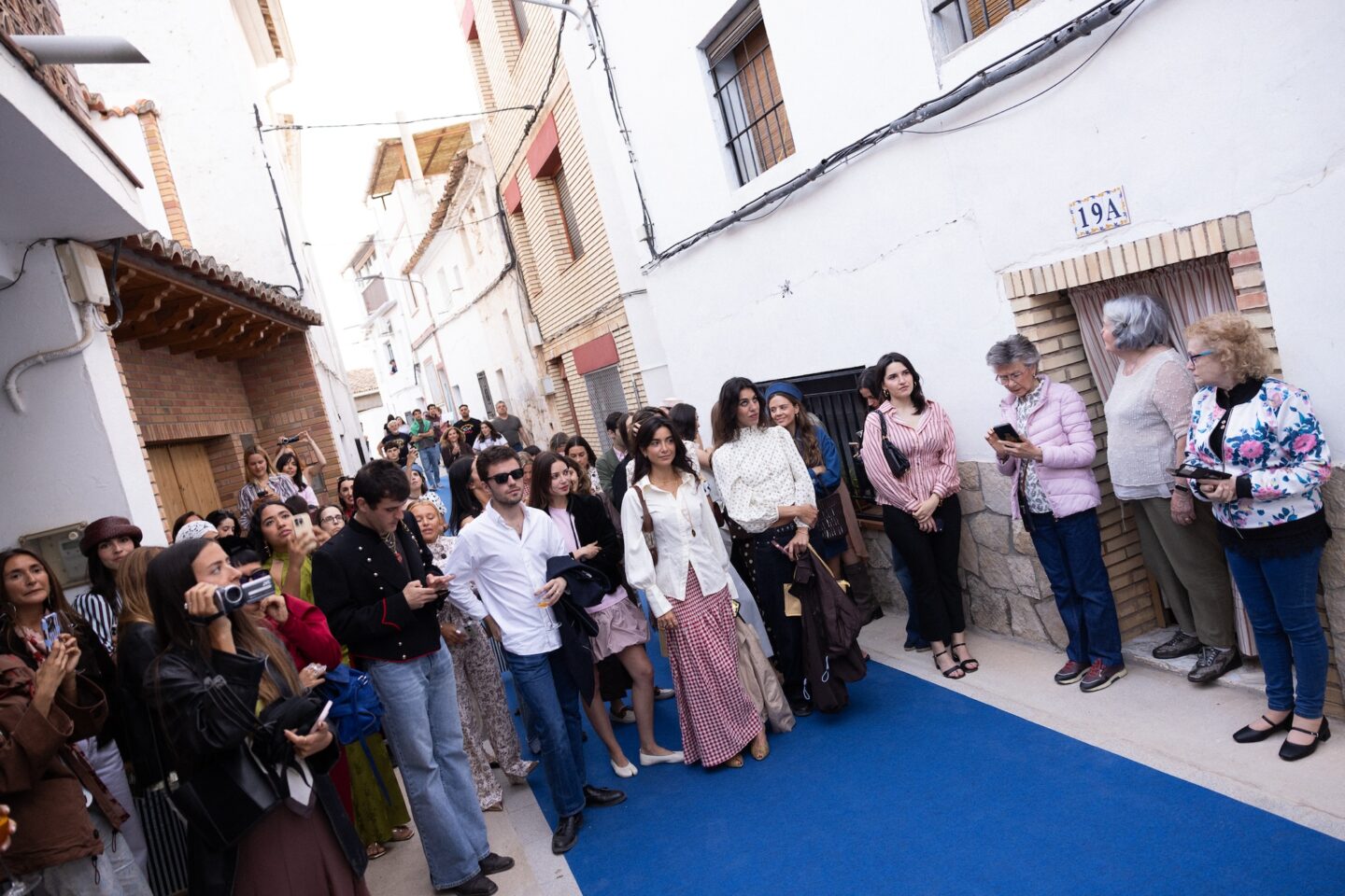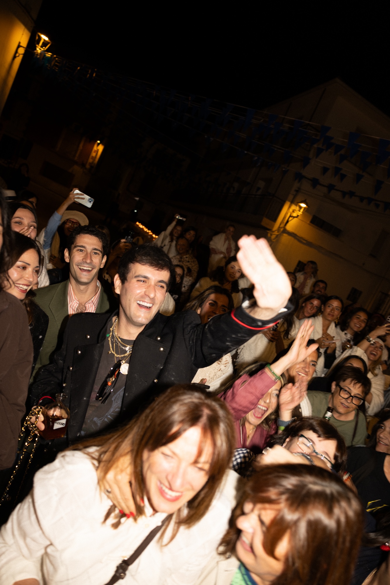 De la mano de FuturaProject, NURRK transformó este municipio aragonés en el epicentro de una propuesta inmersiva que desdibujó los límites de lo que entendemos por desfile, tradición y celebración colectiva. Desde el primer momento, el encuentro dejó claro que no habíamos viajado hasta allí para ser testigos de una simple presentación. Nada más llegar, nos recibieron a las puertas del pueblo en un gesto que marcaba el tono de lo que estaba por venir: cada uno de nosotros recibimos las medidas de la Virgen del Pilar, un detalle cargado de simbolismo y conexión con el territorio. Después, comenzamos el recorrido por el pueblo, acompañados de amigas y amigos como Rossy de Palma, Alejandro Palomo, Carla Paucar, Helena y Lucia Cuesta o Carla Menéndez, entre muchas otras, hasta llegar a la ermita de San Roque.