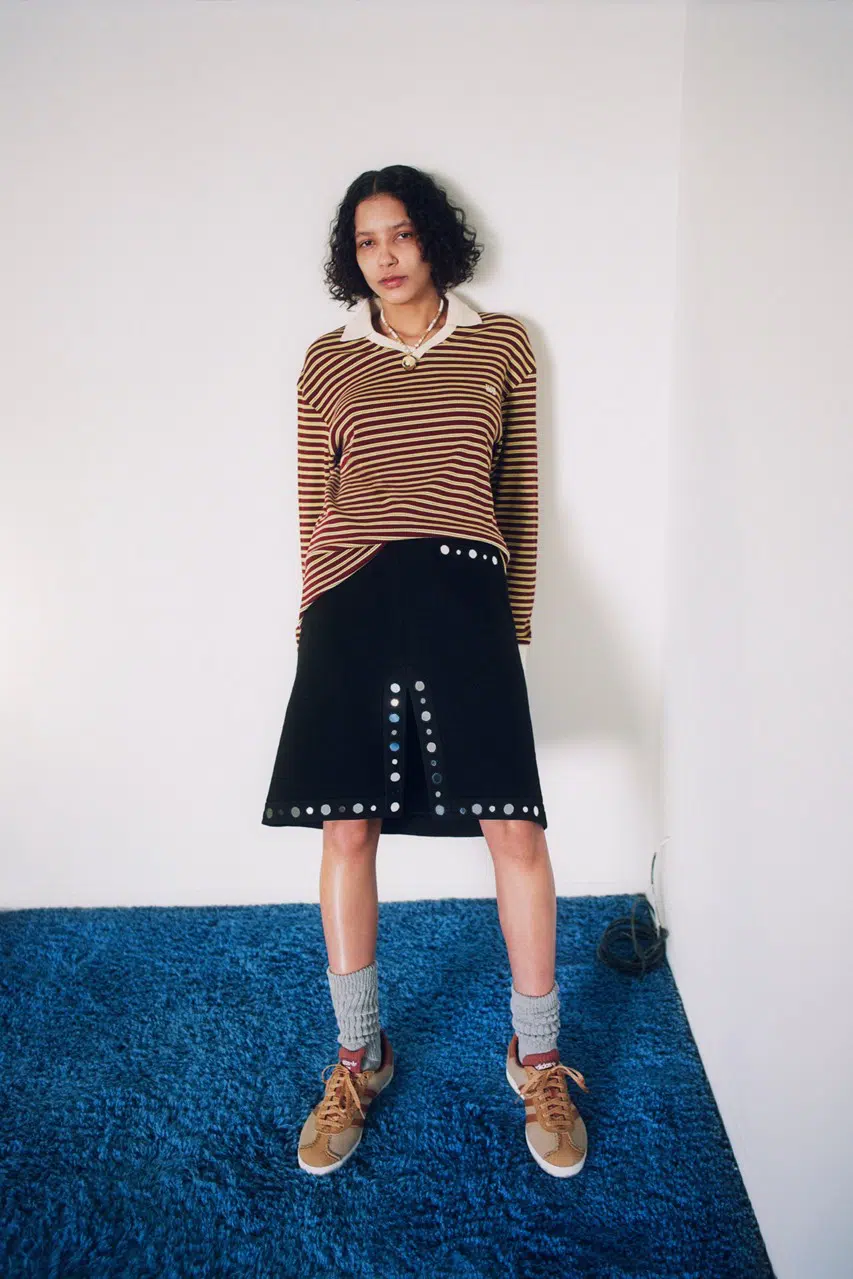 Otra cosa a la que la diseñadora ha dedicado tiempo es a explorar en profundidad su cultura e infundirla con los conceptos del lujo tradicional y parte de esta colección ha sido confeccionada con algodón tejido a mano en Burkina Faso, África Occidental, y combinada con las zapatillas «Gazelle» (en tonos retro y con una nueva estética deconstruida) en colaboración con Adidas Originals y con aplicaciones de joyas y un nuevo modelo estilo «Mary-Janes», algunas de ellas con brocados brillantes y en colores limpios.
