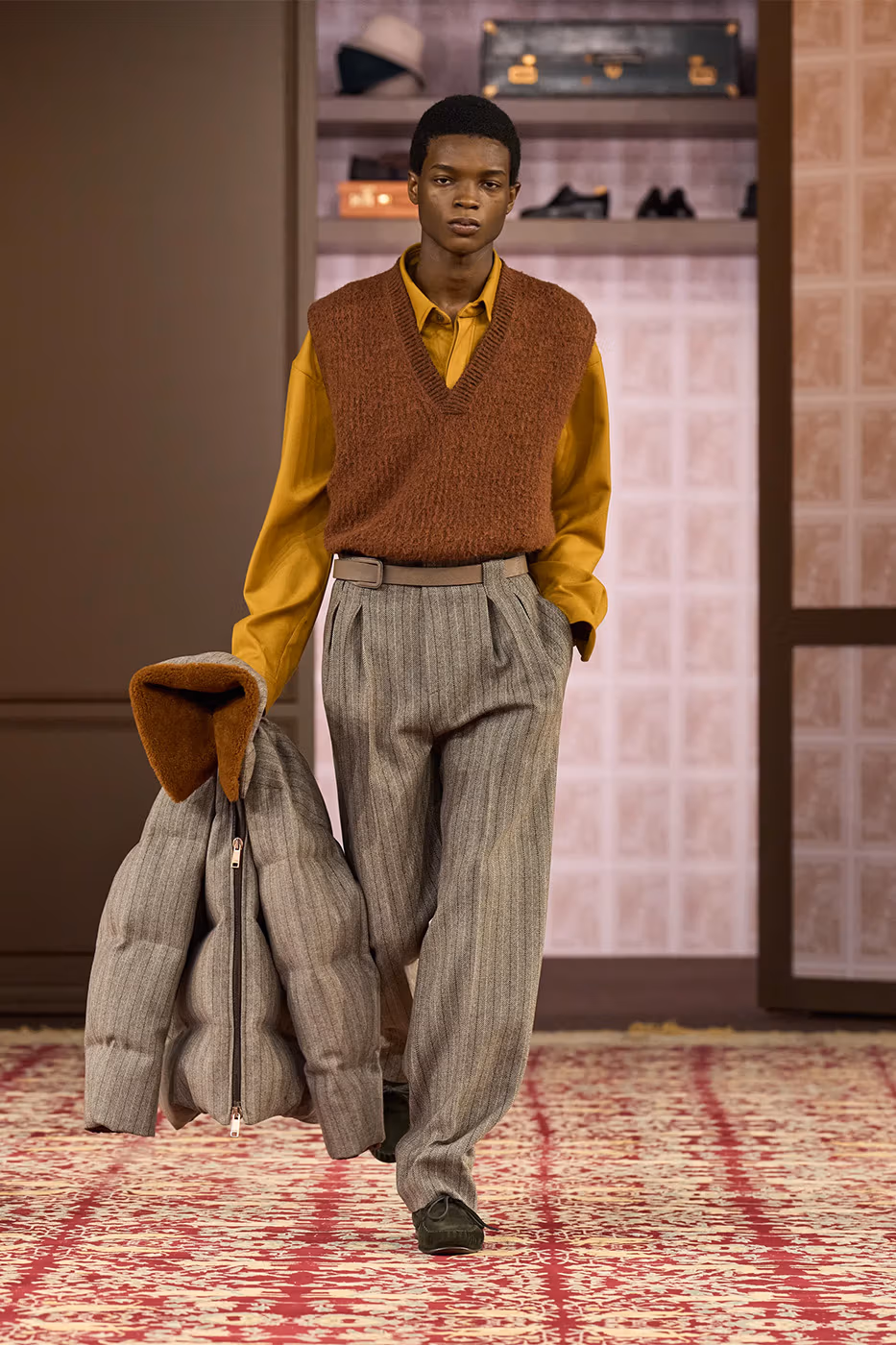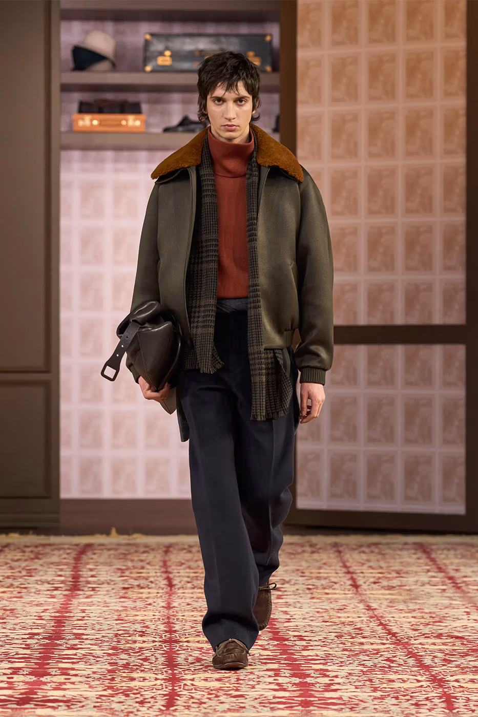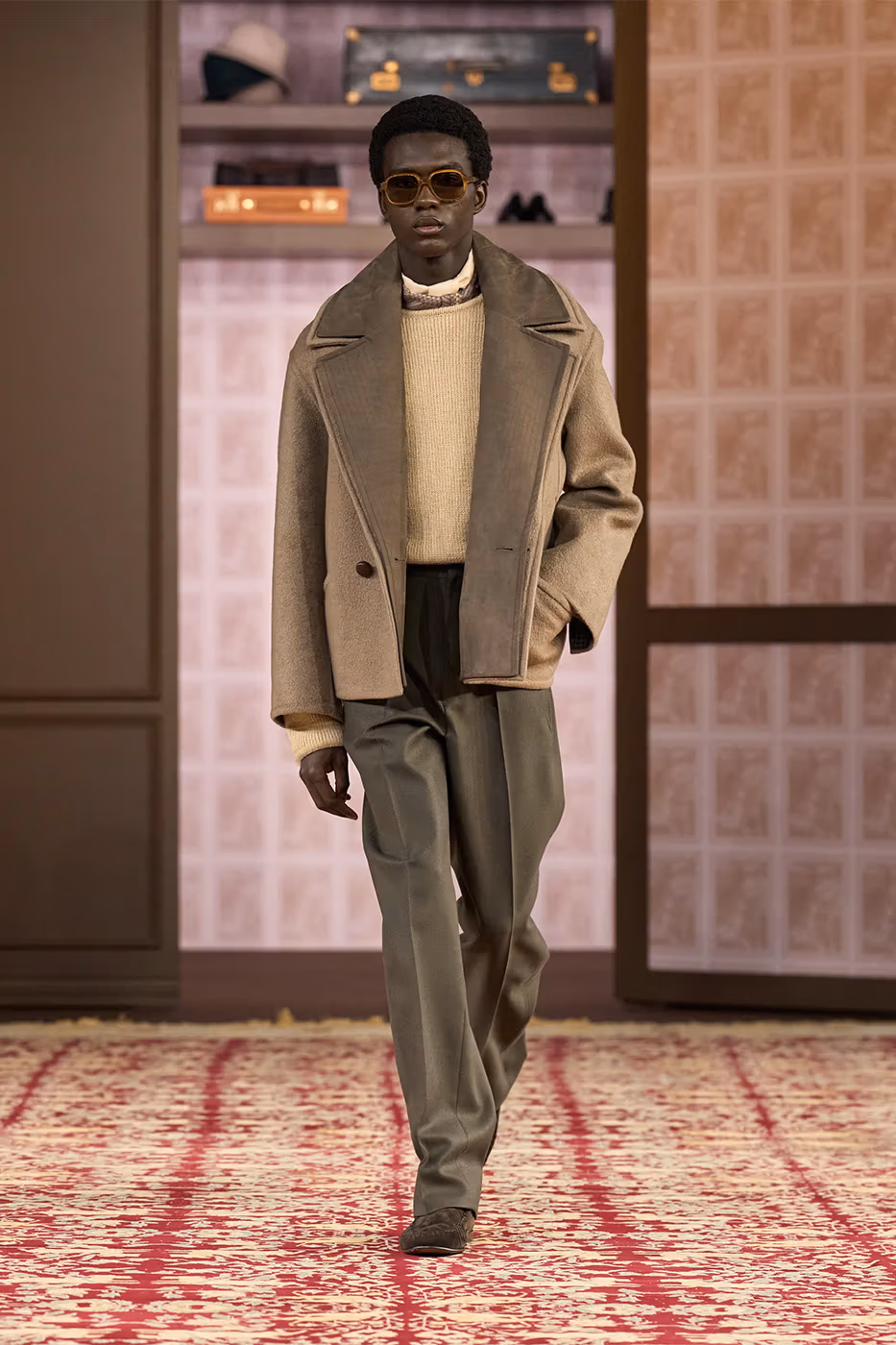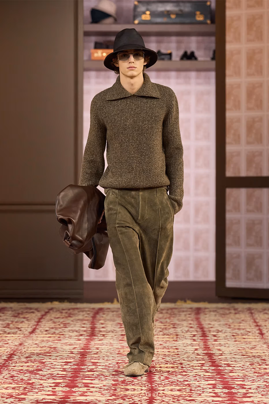 El trabajo con los tejidos es uno de los ejes de la colección. Tejidos conocidos se transforman gracias a la innovación. Aparecen jacquards desarrollados con fibras de papel reciclado, herringbone estampado y shearling de cashmere, que aportan ligereza visual y táctil. Al mismo tiempo, la lana Trofeo mantiene el vínculo con el saber hacer histórico de la casa.