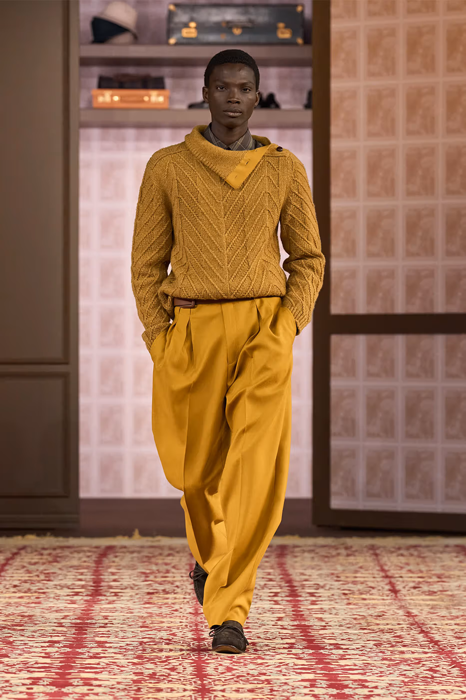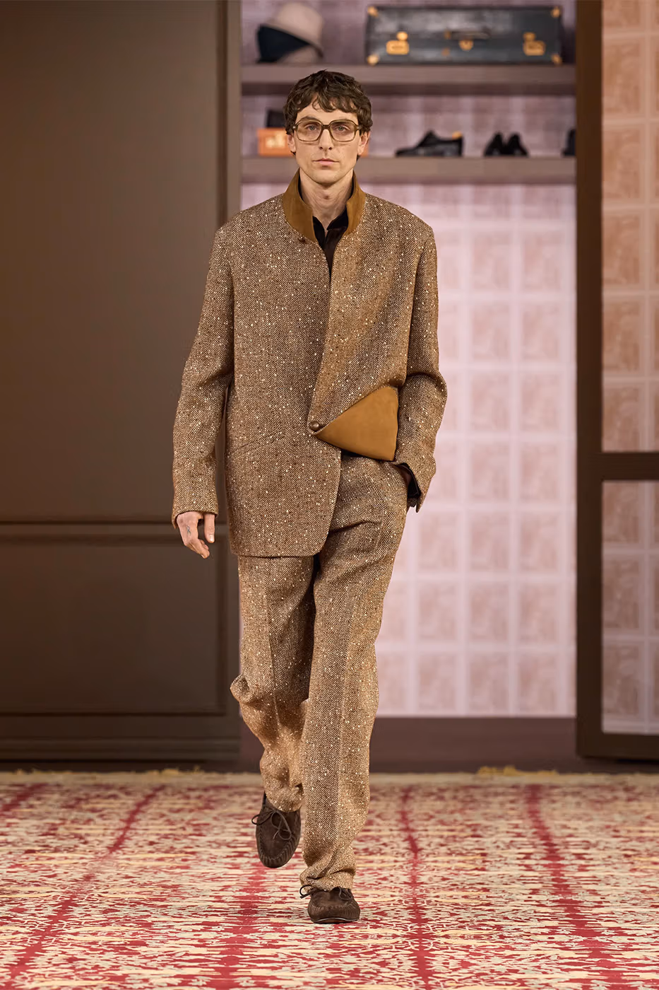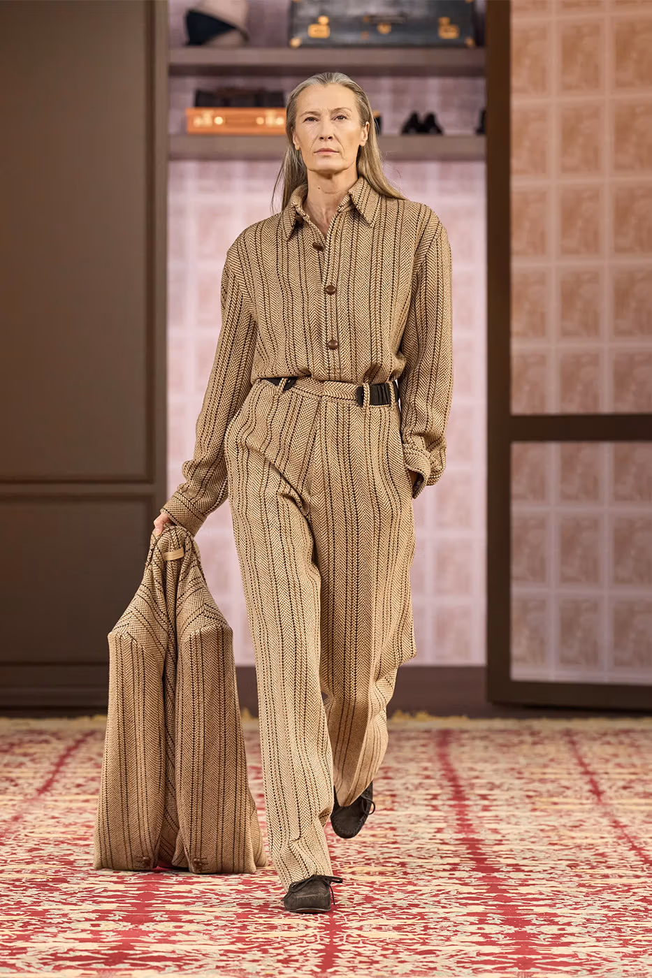 El trabajo con los tejidos es uno de los ejes de la colección. Tejidos conocidos se transforman gracias a la innovación. Aparecen jacquards desarrollados con fibras de papel reciclado, herringbone estampado y shearling de cashmere, que aportan ligereza visual y táctil. Al mismo tiempo, la lana Trofeo mantiene el vínculo con el saber hacer histórico de la casa.