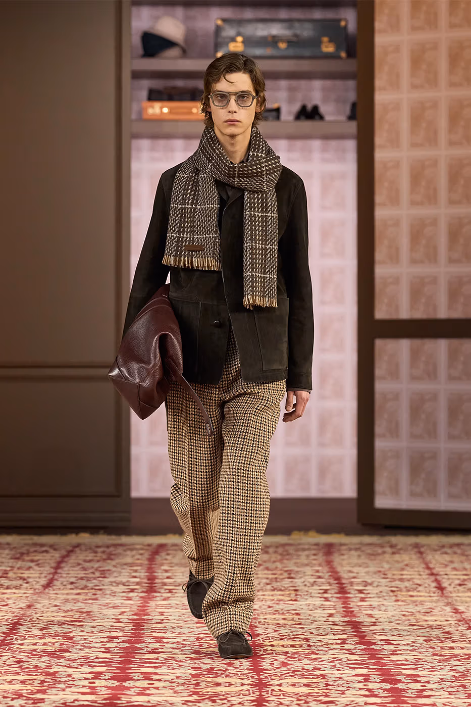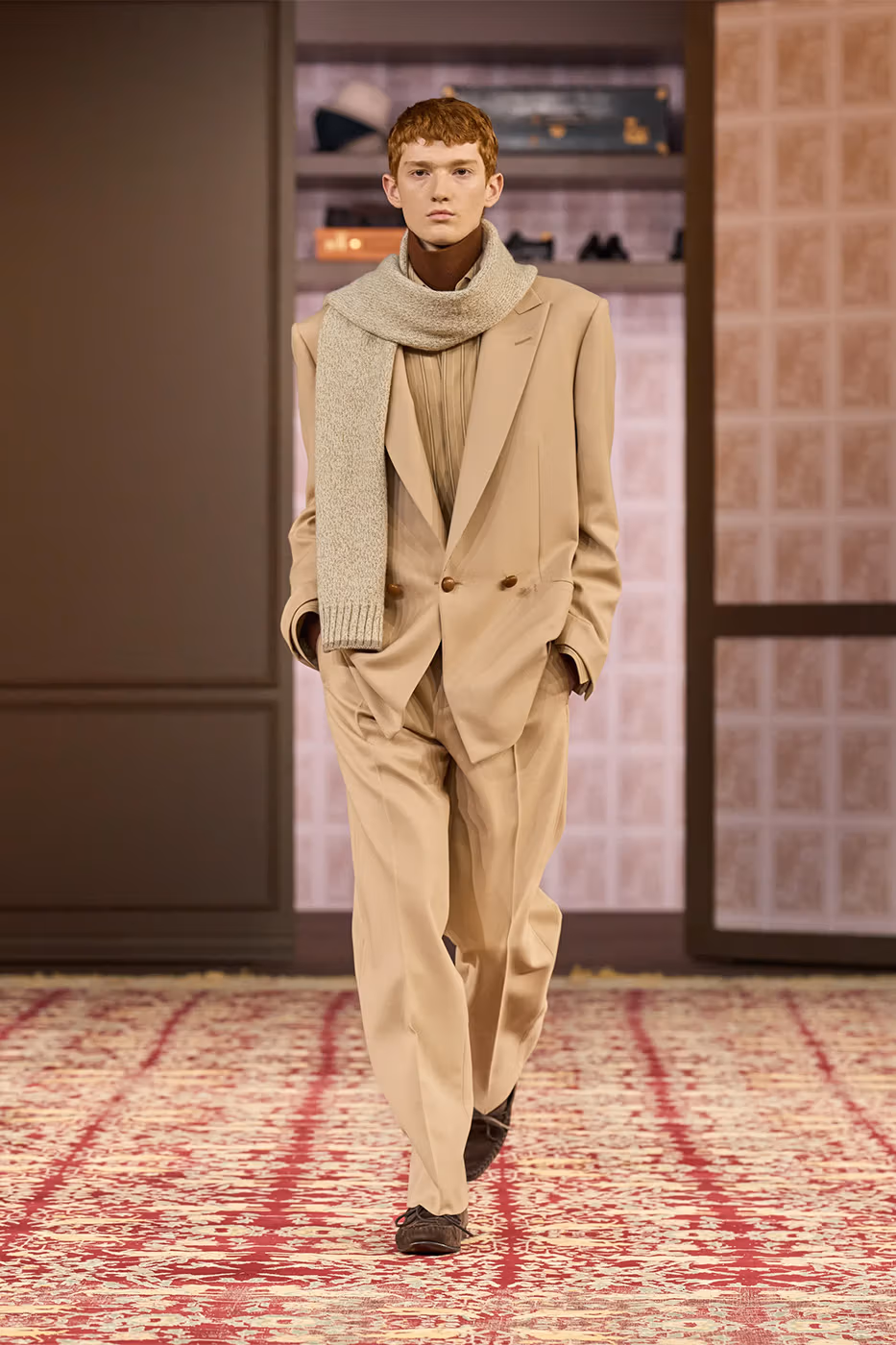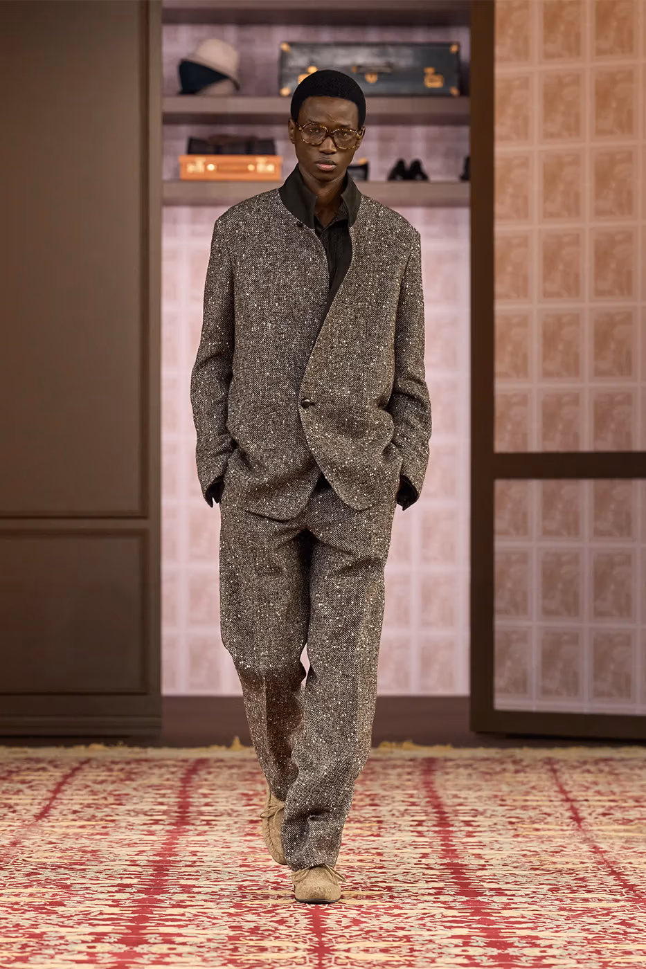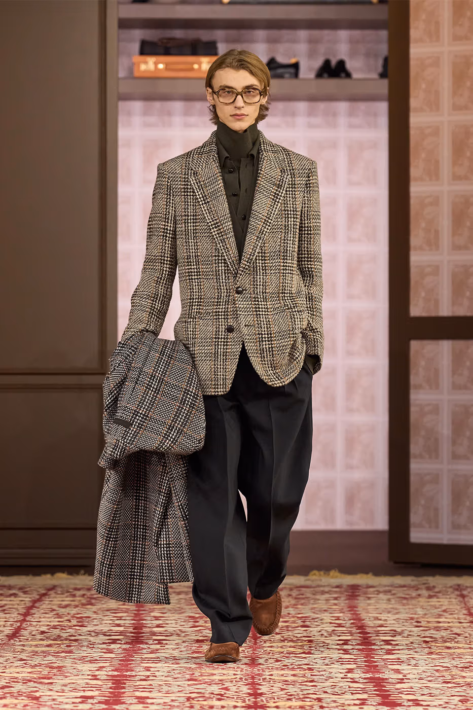 El trabajo con los tejidos es uno de los ejes de la colección. Tejidos conocidos se transforman gracias a la innovación. Aparecen jacquards desarrollados con fibras de papel reciclado, herringbone estampado y shearling de cashmere, que aportan ligereza visual y táctil. Al mismo tiempo, la lana Trofeo mantiene el vínculo con el saber hacer histórico de la casa.