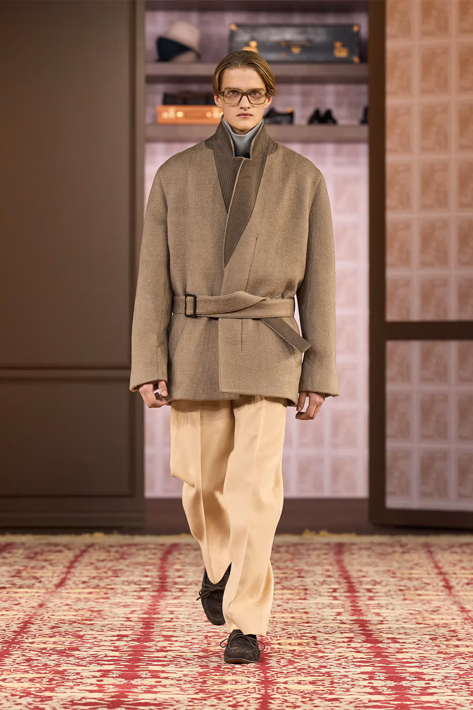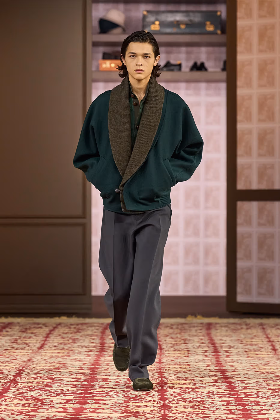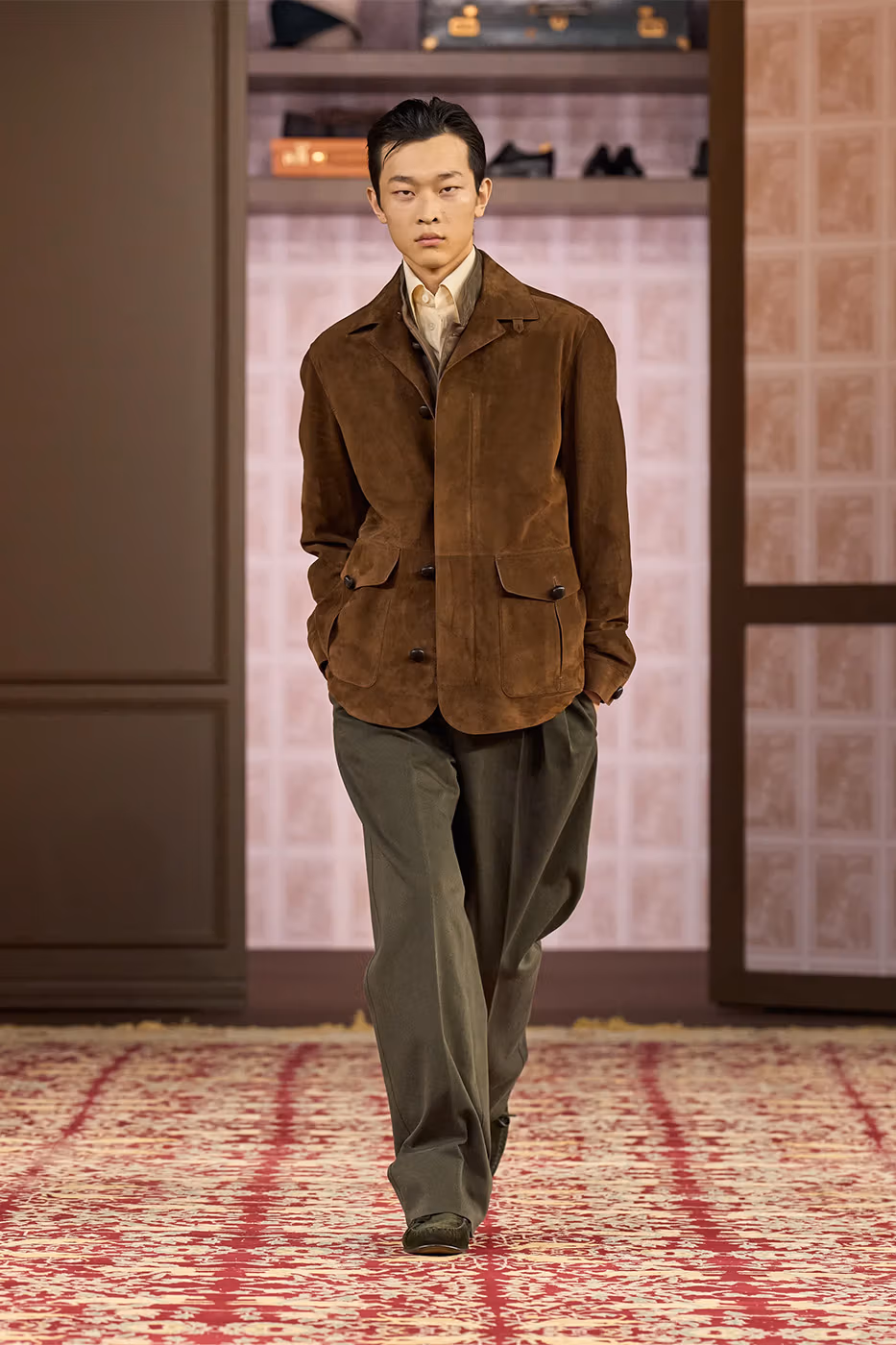 Para reforzar esta idea, el desfile tuvo lugar en un espacio ovalado rodeado de piezas pertenecientes a cuatro generaciones de la familia Zegna. Entre ellas destacaba la primera chaqueta confeccionada por el fundador en 1930. De este modo, la puesta en escena subrayó el mensaje central de la colección. Cuando el diseño y los materiales están pensados para durar, la moda deja de ser pasajera y se transforma en legado.