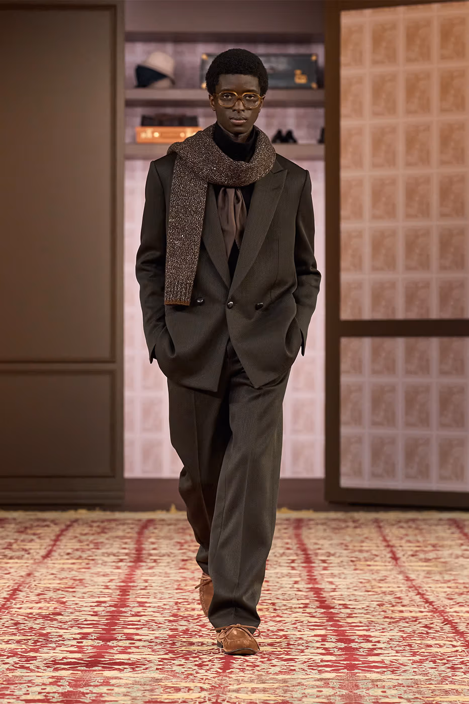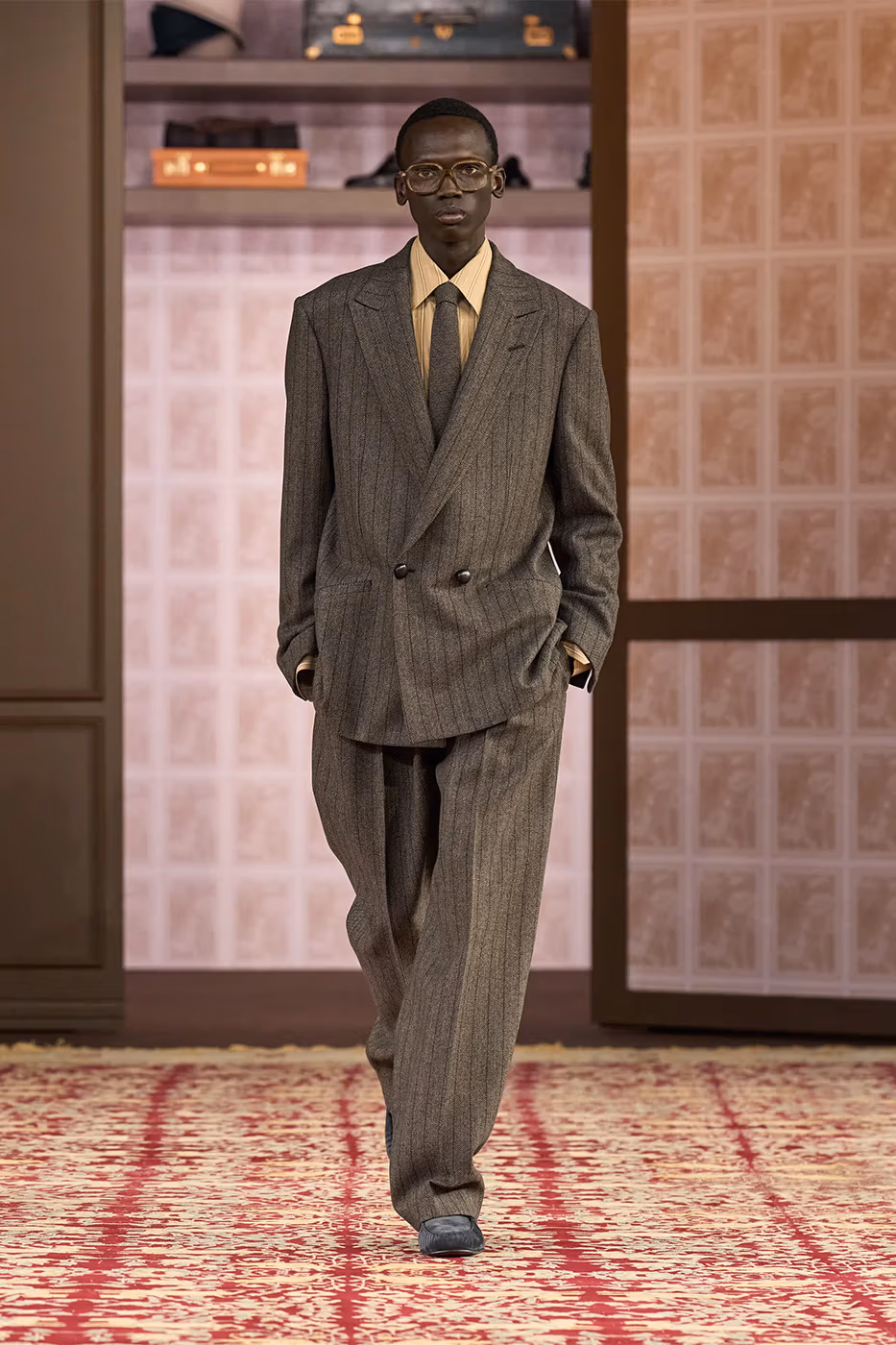 En el plano creativo, Sartori revisa siluetas de archivo desde una visión actual. Por un lado, aparecen referencias claras a distintas épocas, como los cuadros pesados y los tonos cálidos que recuerdan a los años setenta. Por otro, se incorporan pliegues inspirados en los abrigos tradicionales de loden del norte de Italia.